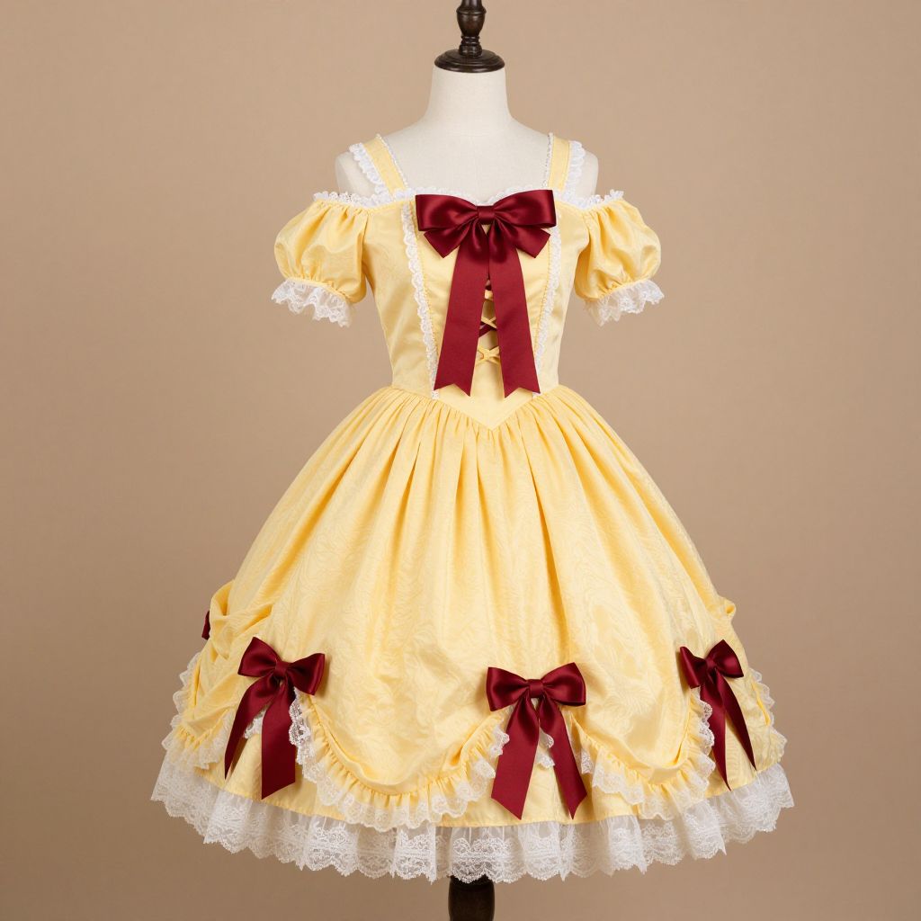Photograph of a vintage-style, cream-yellow dress with puffed sleeves, white lace trim, and five deep red bows on the skirt, displayed on