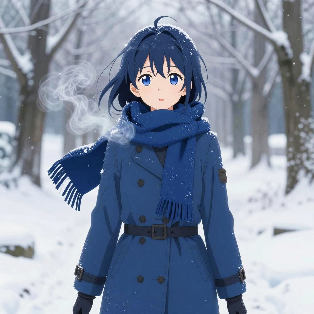 Anime girl blue in winter landscape, character dressed in elegant blue winter coat and scarf, snow gently falling around her, frosty breath visible, crisp cold atmosphere, realistic yet stylized anime art, detailed background with icy trees