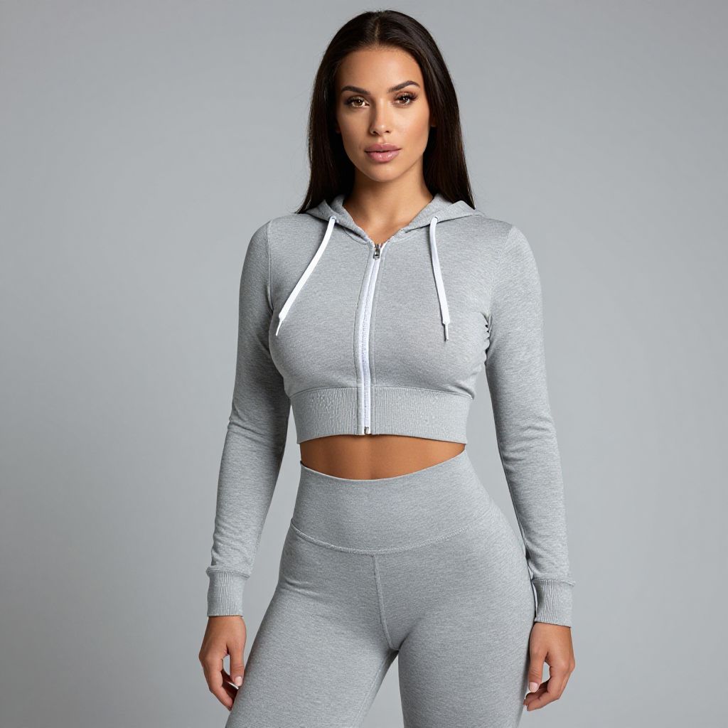 "Woman, athleisure, heather gray cropped hoodie with white drawstrings, zipper front, long sleeves with ribbed cuffs, matching high-waisted leggings, fitted silhouette, studio background.. Sexy. Pretty face and beаutiful eyes. Big breasts."