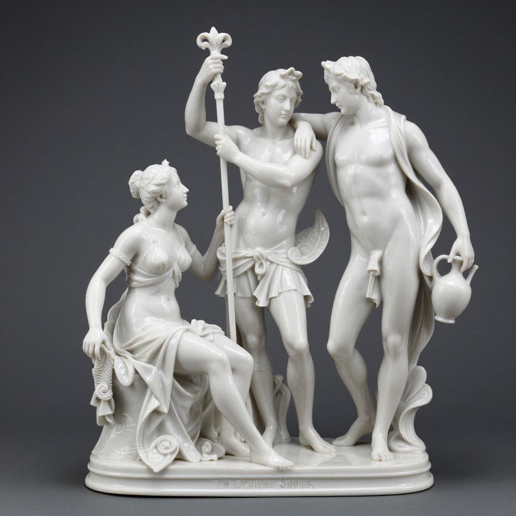 A finely crafted Meissen porcelain sculpture titled \"The Drunken Silenus,\" modeled by Ernst August, depicts a classical scene featuring three figures—a seated woman, a standing man holding a staff, and another man leaning on him while holding a jug—rendered in high-definition detail with dramatic lighting that accentuates the intricate textures and forms of the medium.