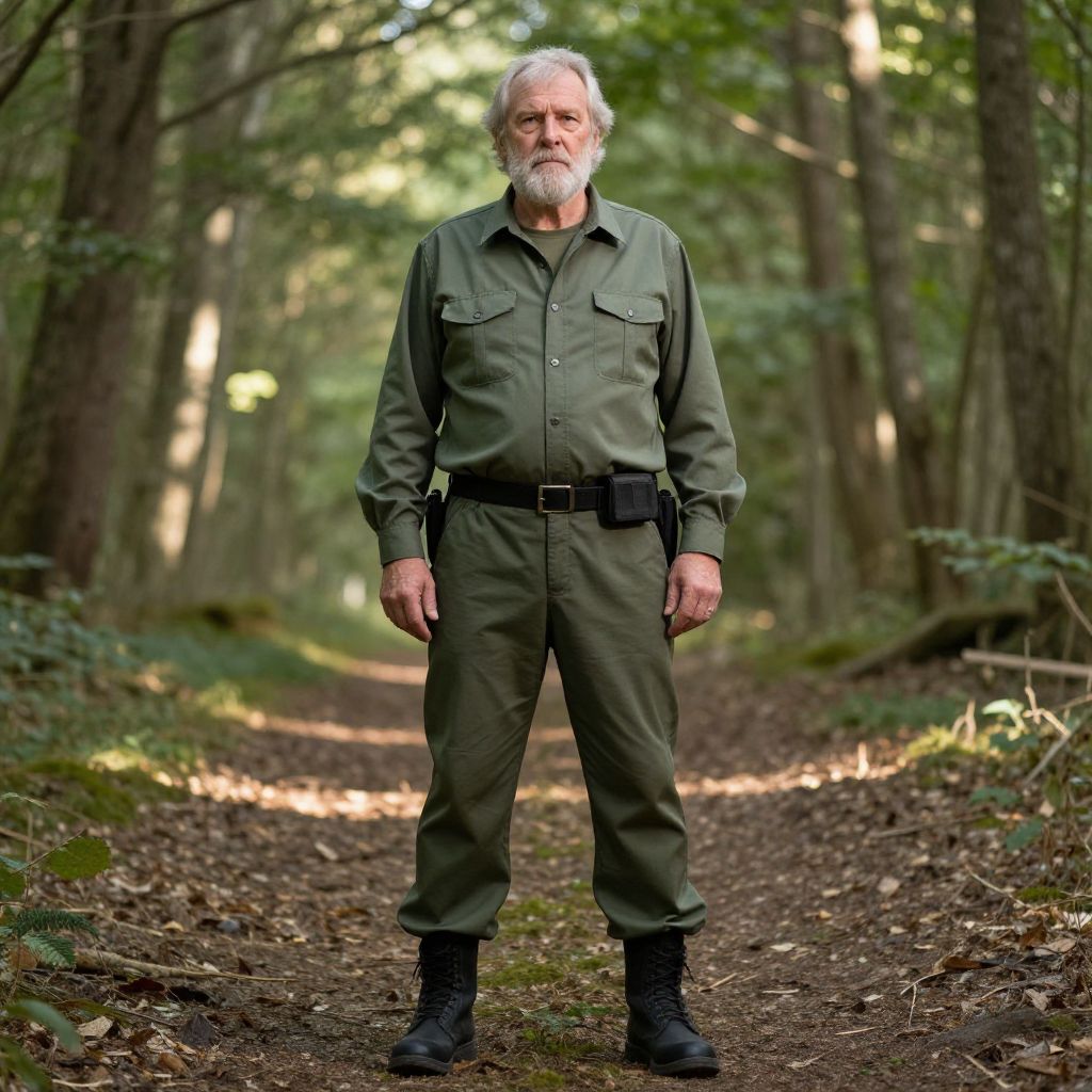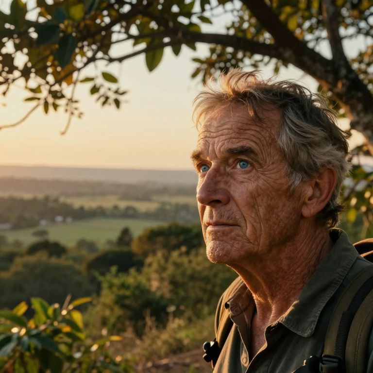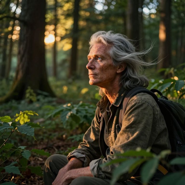 Craft an intricate portrait that embodies the spirit of an experienced traveler with sun-etched skin, captivating blue eyes, and silvery hair tousled by the wind. The subject is situated amidst a tranquil grove bathed in the warm glow of golden hour light, which filters through towering trees and outlines their rugged clothing and the forest floor beneath them with intricate shadows. As they cast a contemplative gaze towards the horizon, their expression conveys both solitude and deep understanding, mirroring the challenges and victories of their life's odyssey. From an unconventional perspective, this scene invites viewers to peer through a dense carpet of lush green foliage at this enigmatic figure, seamlessly blending elements of fantasy with realism to evoke an emotional spectrum that resonates with curiosity and introspection.