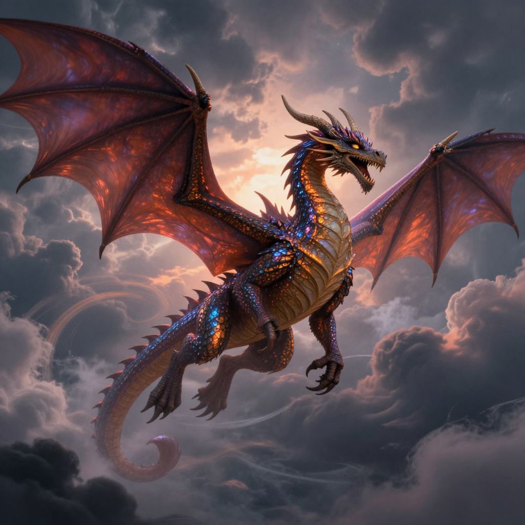 Craft an image in the enchanting style reminiscent of classic \"Dungeons & Dragons\" fantasy illustrations, portraying a regal dragon with shimmering scales reflecting the vibrant colors of dusk, elegantly soaring amidst turbulent storm clouds. Capture this awe-inspiring creature from a dramatic low-angle viewpoint, as if seen through the eyes of its minuscule prey, emphasizing its colossal size and formidable strength. This scene should evoke an array of emotions ranging from fear to amazement, as the dragon's commanding presence captivates both its foes and admirers alike, with each powerful flap of its wings casting a captivating spell over all who bear witness to this breathtaking display.