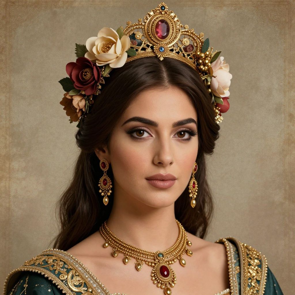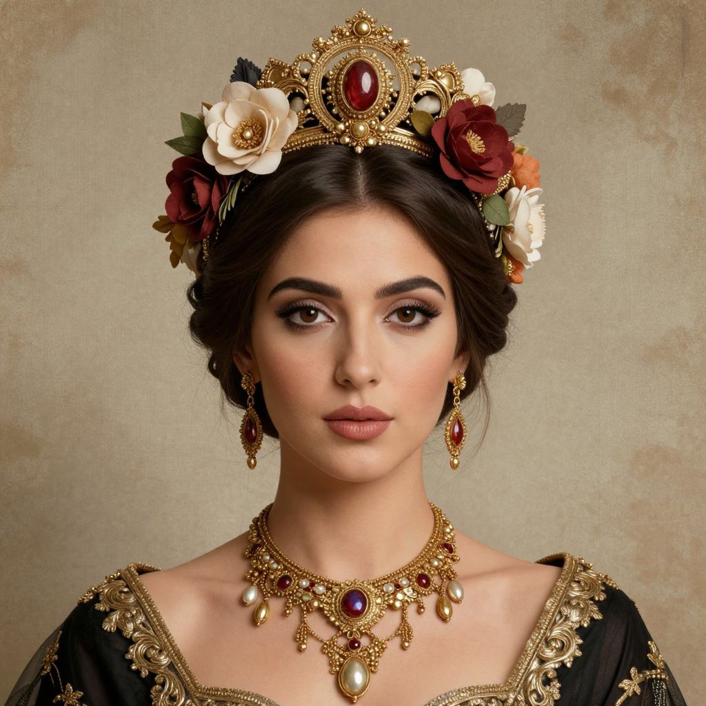 A digitally rendered portrait featuring a woman adorned with an ornate floral headpiece and gold jewelry, set against a vintage-inspired background, showcasing the intricate detail and classical elegance characteristic of Maryam Foroozanfar's artistic style.