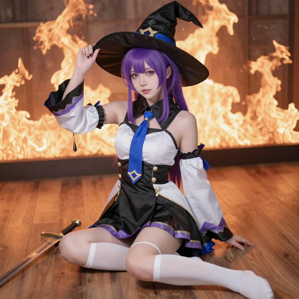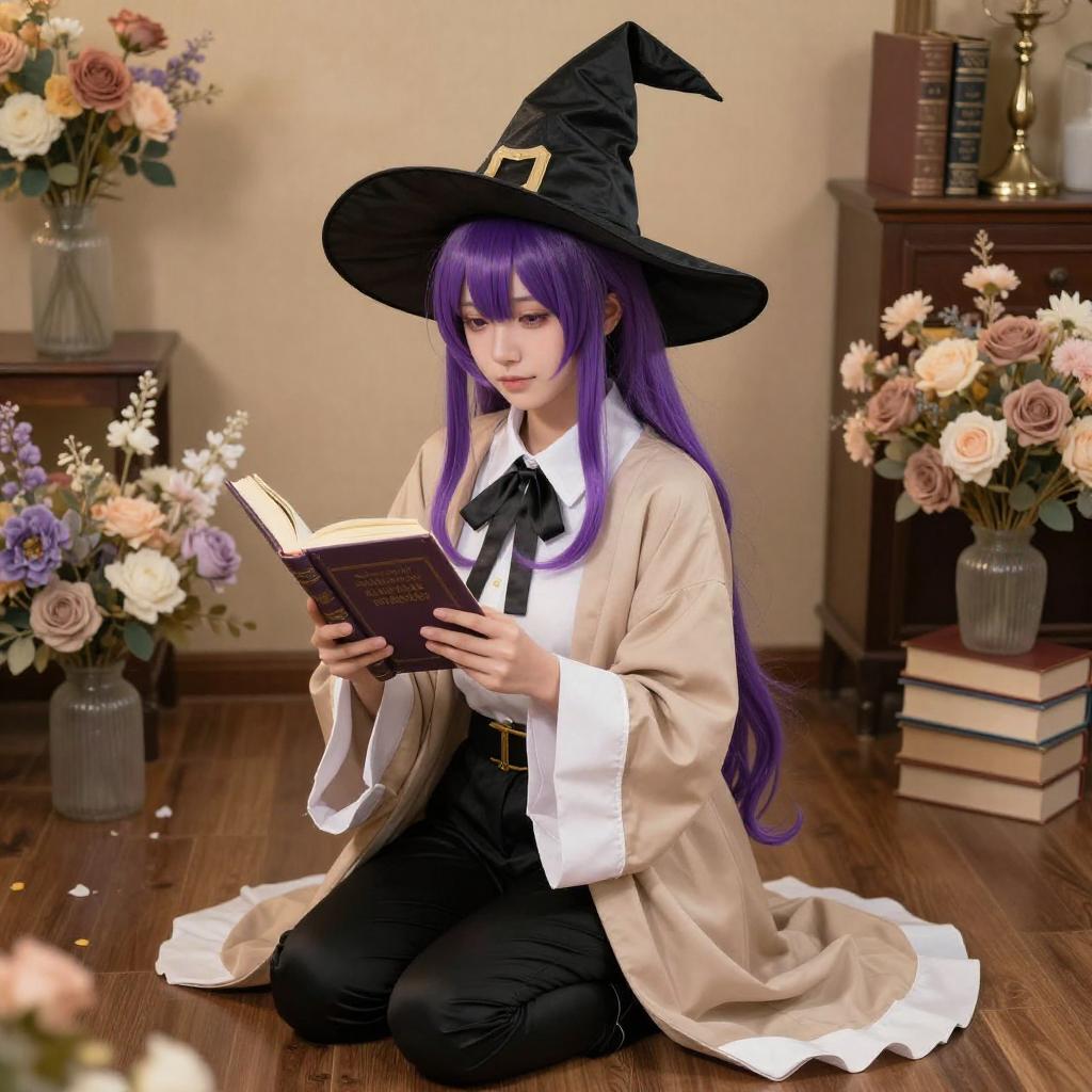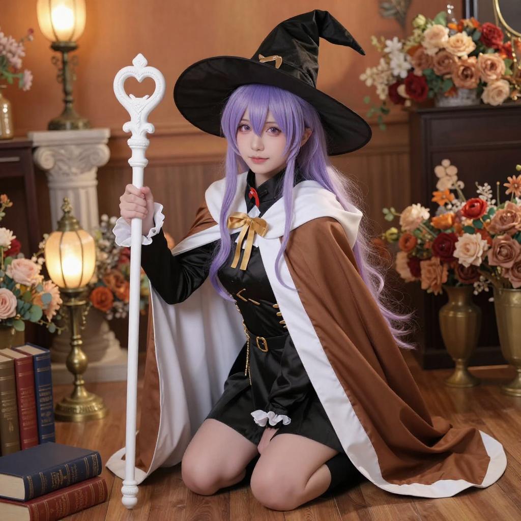 A young woman with light purple hair and fair skin, dressed in a white and blue wizard costume with a black hat, kneels on a wooden floor. She holds a white wand in her right hand, with books and a fireplace in the warm, lit background. Her expression is focused and slightly playful.