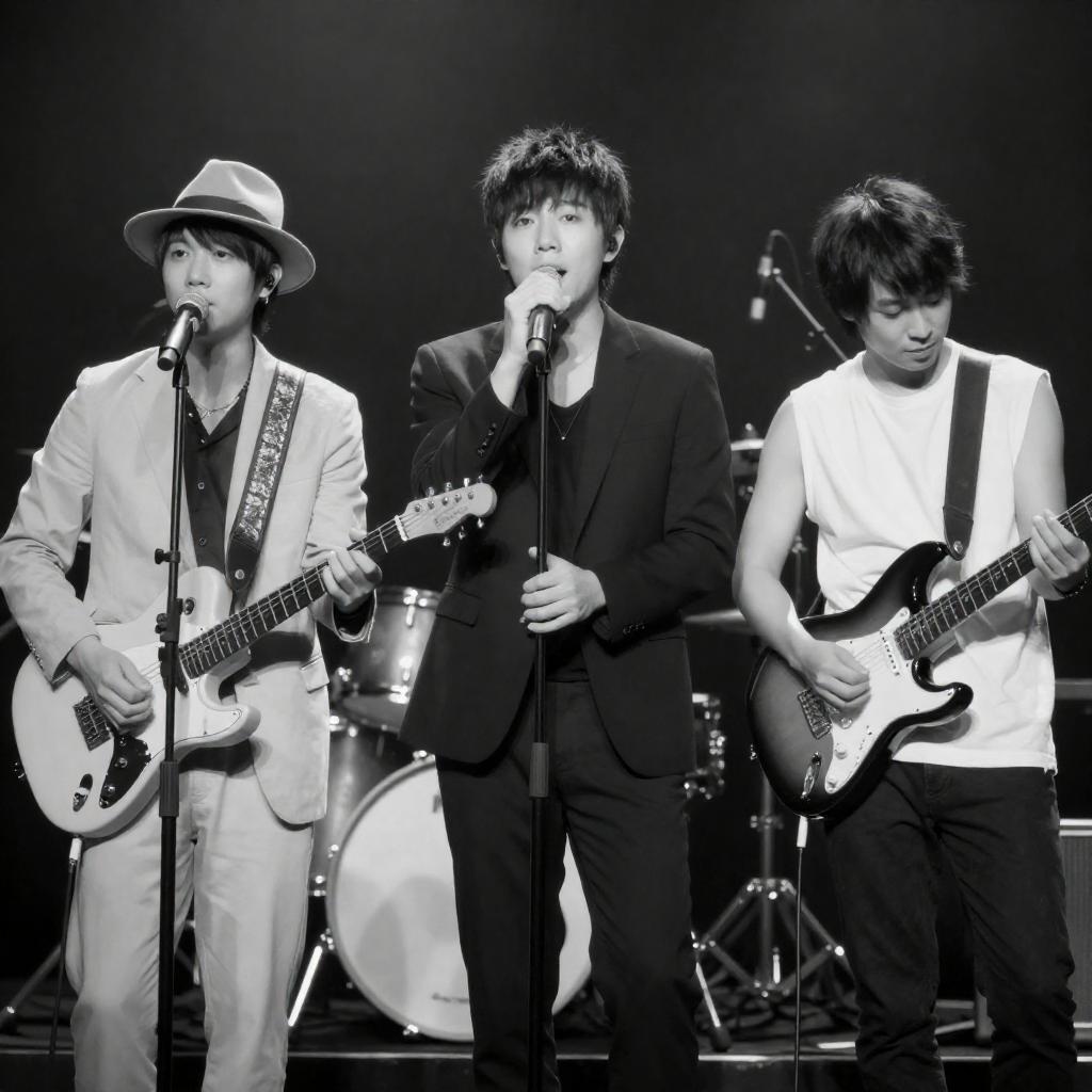 Black and white photograph showcasing three male musicians performing live on stage. Left guitarist wears a light-colored suit and hat, holding an electric guitar. The center musician, dressed in a dark suit, is singing into a microphone. Right guitarist is wearing a white sleeveless shirt and playing an electric guitar. Drum set is visible in the background, creating a classic band setup.
