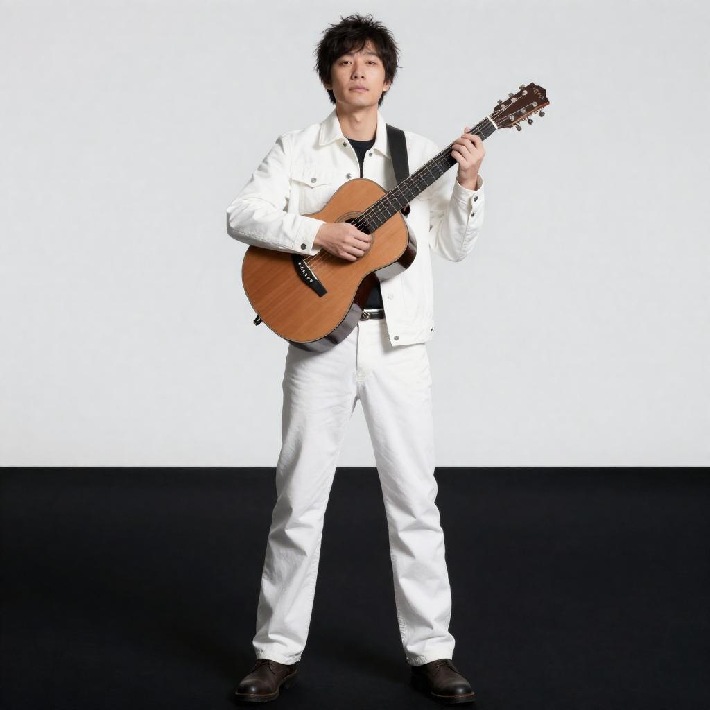 Black and white photograph of three male musicians on stage. Guitarist in light suit and hat on left, singer in dark suit in center, guitarist in white sleeveless shirt on right. Drums in background. All holding guitars. Singer sings into microphone. All musicians facing forward.