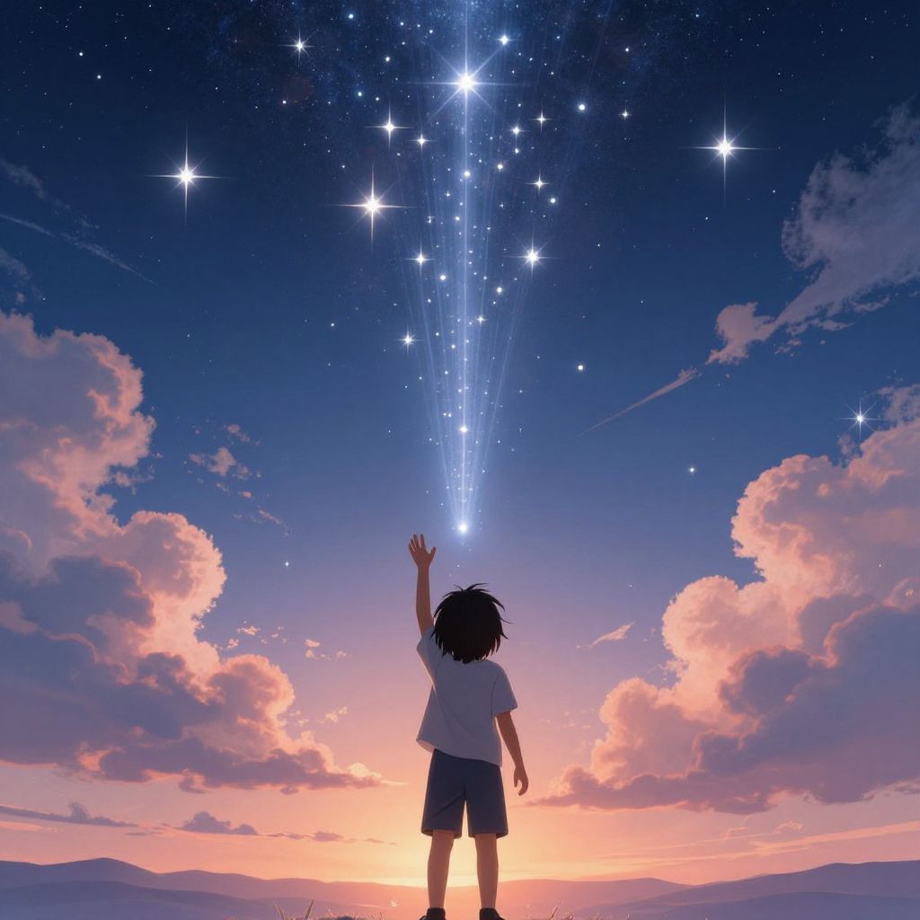 Digital anime-style illustration depicting a silhouetted child with short, messy dark hair, standing with one arm raised toward a star-filled, twilight sky. The child wears a white shirt and dark shorts. Bright stars and a blue-white beam of light descend from the sky, illuminating the scene. The horizon glows with a pink-orange sunset, and fluffy clouds are scattered across the sky. The child stands on a flat, shadowy landscape. The overall mood is magical and contemplative, emphasizing the child's connection to the night sky.