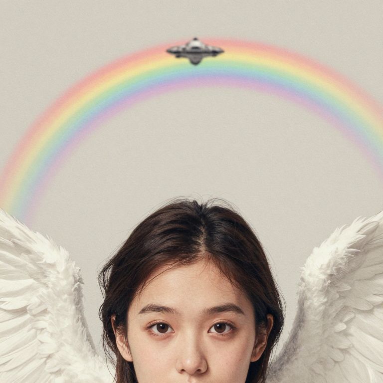 High - angel view, close - up portrait, vague uap interstellar vehicle on top of an ephemeral rainbow in the sky, muted watercolor. minimalist, detailed, heavy under paint, muted colors. ue 5