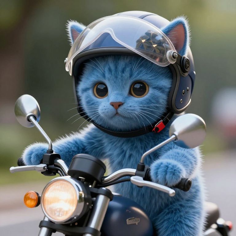 A cute blue kitten wearing a helmet and plush gloves rides a motorcycle, with intricate fur details and soft movie lighting.