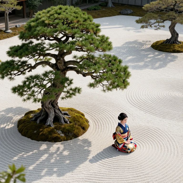 Photograph of a serene Japanese garden featuring a woman with fair skin and black hair in a traditional kimono, seated on a red and black patterned mat to the right. She faces a large, lush green bonsai tree with a twisted trunk, planted on a moss-covered circular stone in the center. The garden's white pebble raked ground creates intricate circular patterns, with sunlight casting soft shadows. In the background, smaller bonsai trees and a traditional wooden fence are visible. The scene exudes tranquility and cultural elegance.