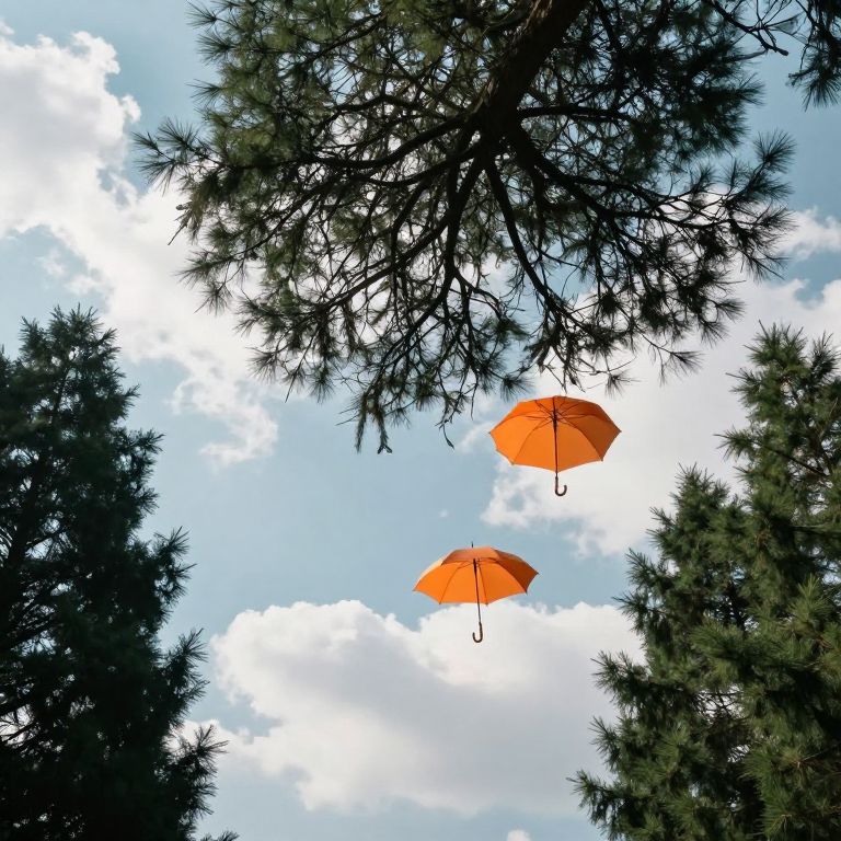 Ethereal orange umbrellas float gracefully among the branches of an inverted tree, its roots sprawling upwards against a serene sky dotted with fluffy clouds and flanked by towering evergreens.