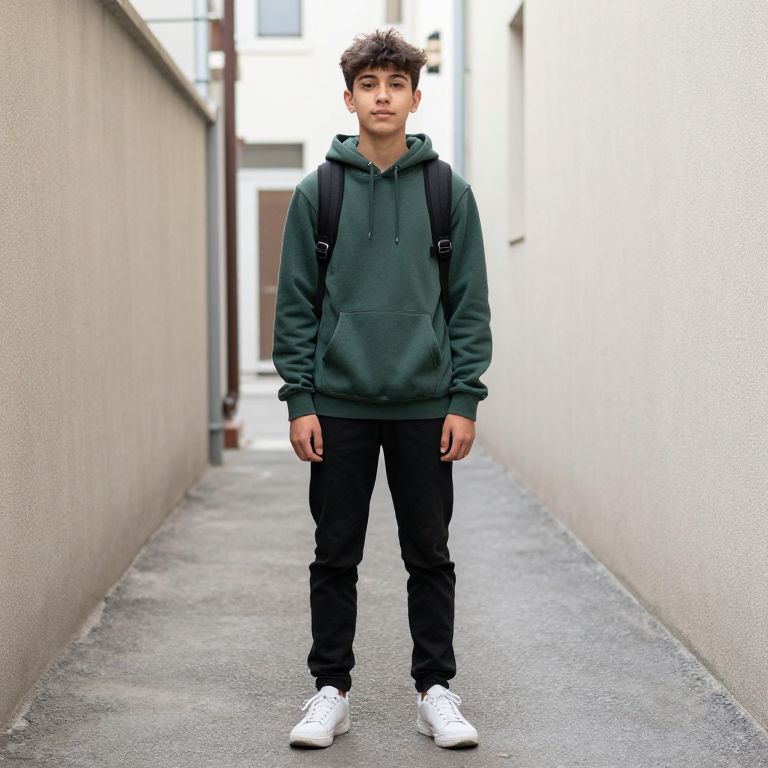 Outfit, boy with a hoodie and backpack standing in a narrow alleyway
