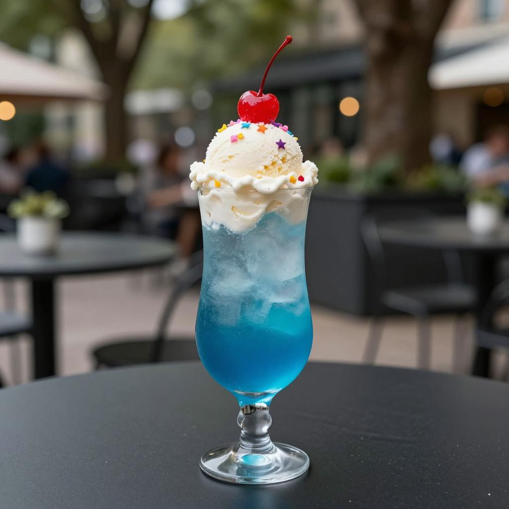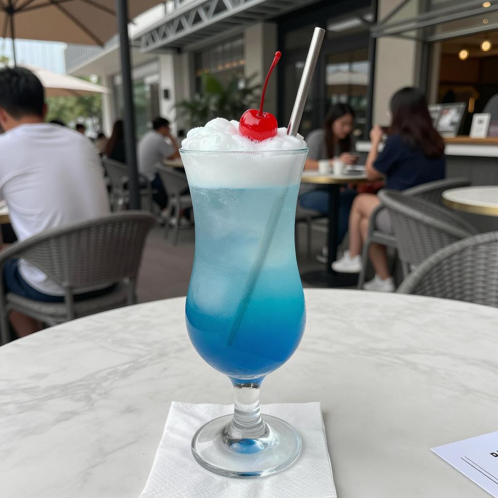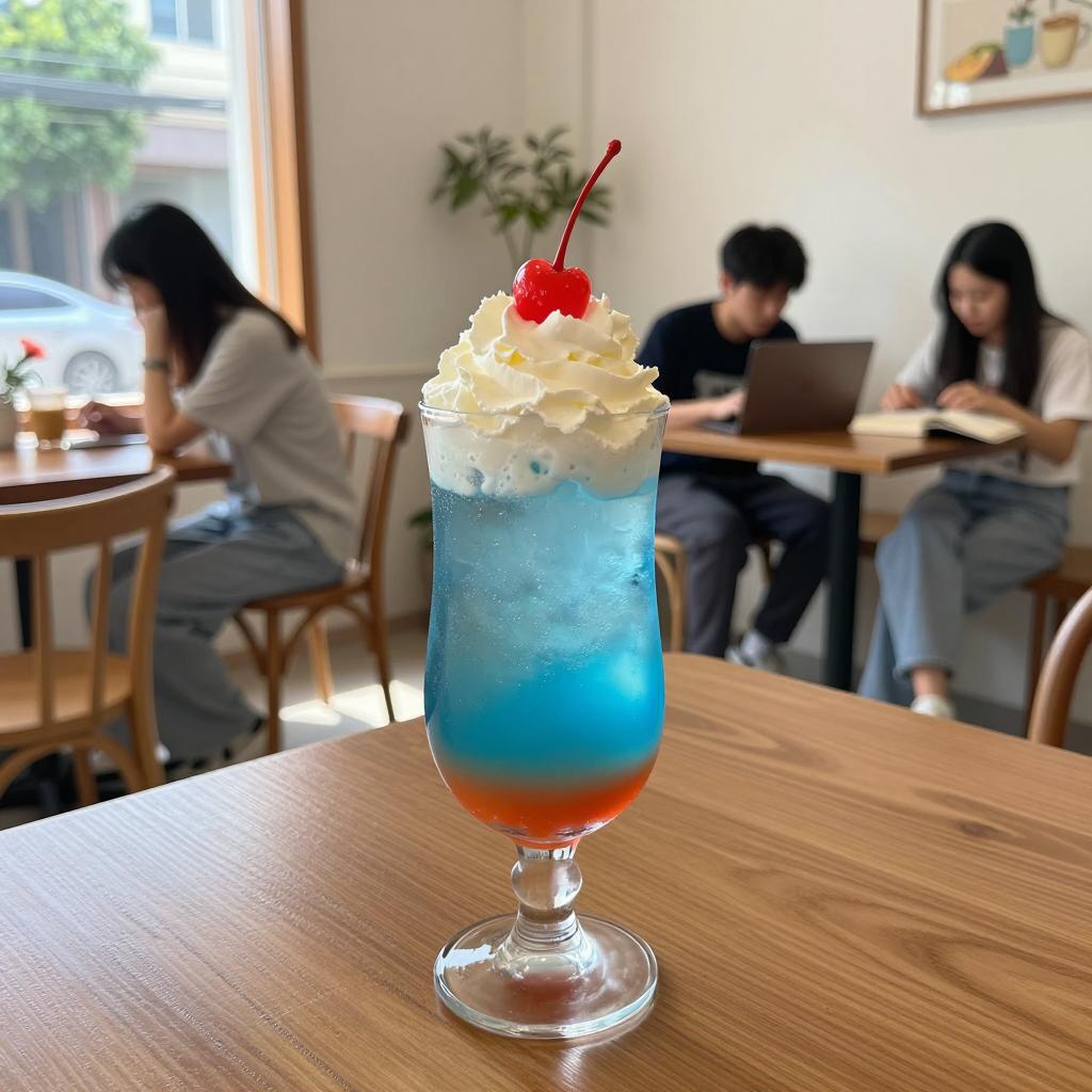 Photograph of a tall, clear glass with a layered blue and orange drink, topped with whipped cream and a cherry. On a wooden table in a bright café with wooden chairs and people in the background. Two people seated at tables, one with a laptop, another with a book. Sunlight streaming through large windows.