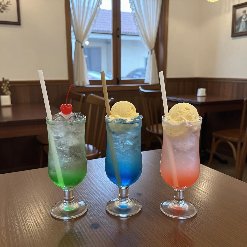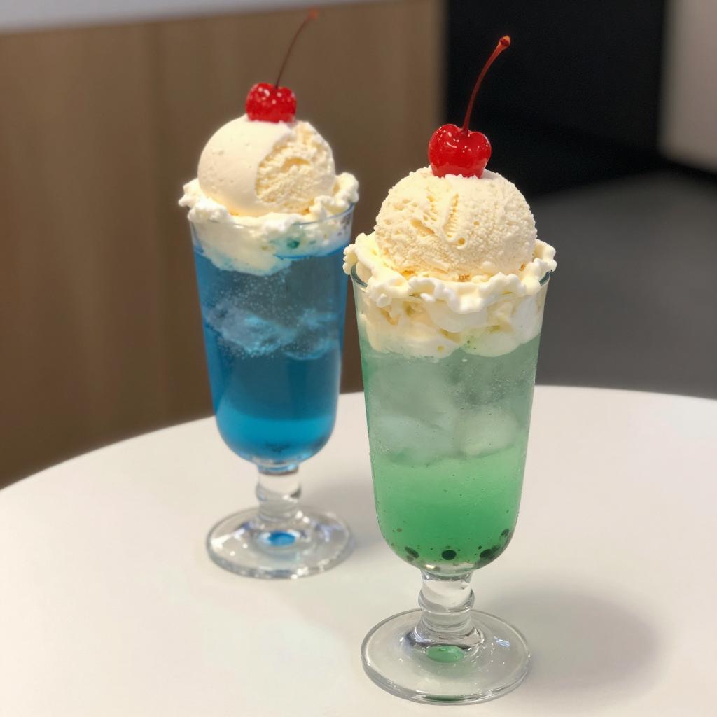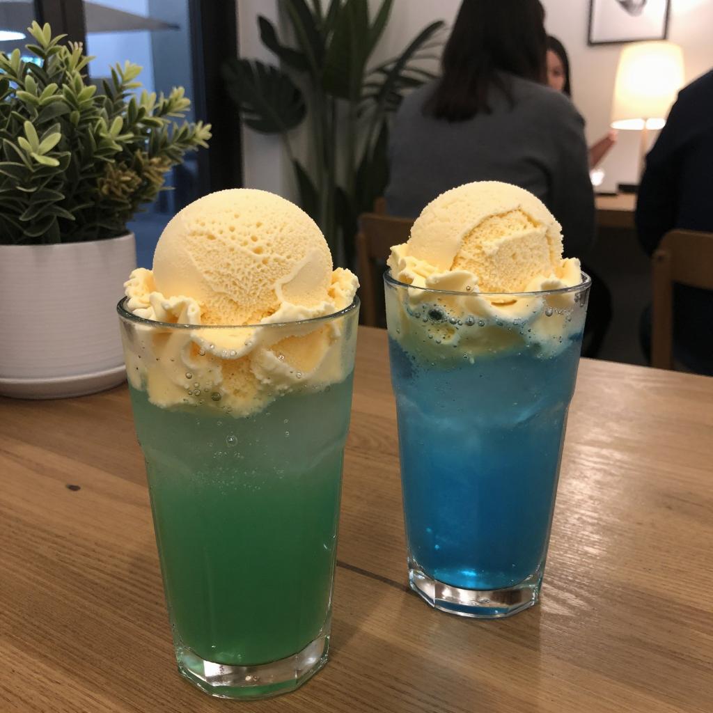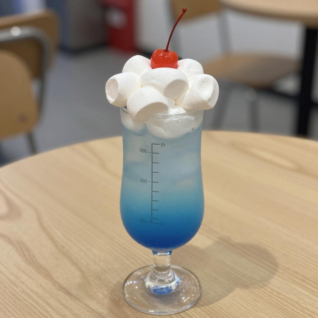 Photograph of a tall, clear glass with a layered blue and orange drink, topped with whipped cream and a cherry. On a wooden table in a bright café with wooden chairs and people in the background. Two people seated at tables, one with a laptop, another with a book. Sunlight streaming through large windows.