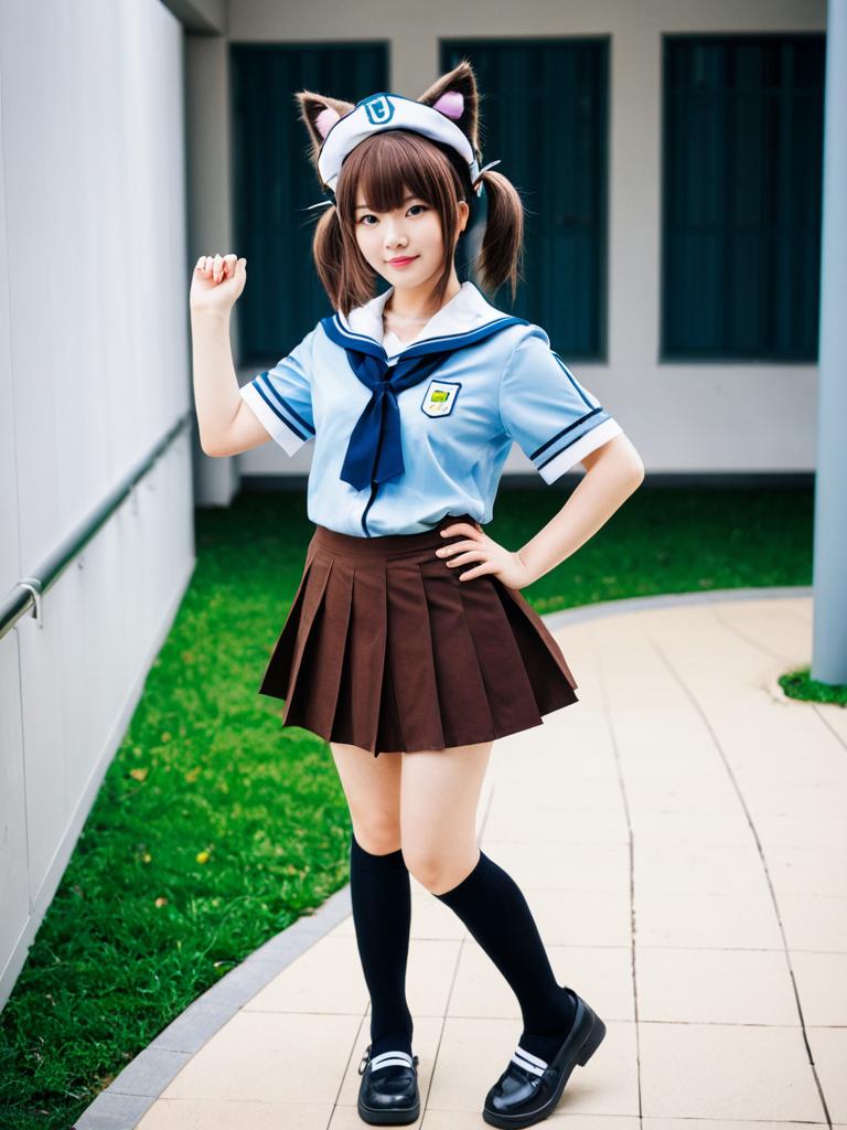 Photograph of an Asian girl in a school uniform and catgirl cosplay. She has brown pigtails, wears a white sailor hat with black cat ears, a light blue sailor shirt with a black neckerchief, a brown pleated skirt, black knee-high socks, and black shoes. She stands in a sunlit courtyard with grass on the left and a white building with black windows in the background. Her right hand is raised, touching the wall, and she smiles confidently. The image has a high-contrast, slightly oversaturated style.
