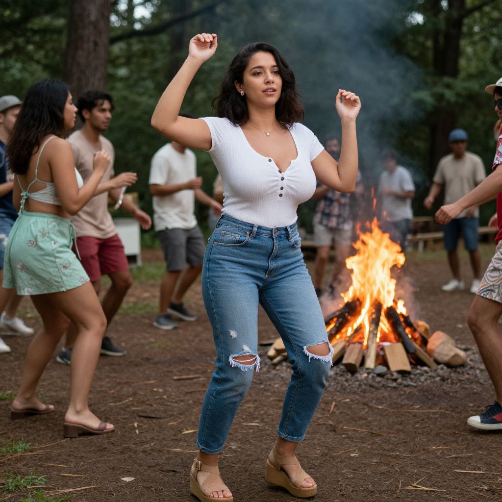 Photograph of a curvy, dark-haired woman in a white top and ripped jeans dancing around a campfire in a forest, surrounded by casually dressed