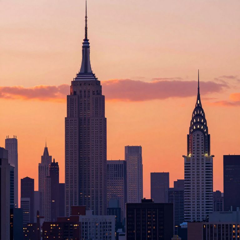 A vibrant sunset over Manhattan, featuring the Empire State Building, Chrysler Building, and a flat design with a rich color palette, creating a peaceful atmosphere.