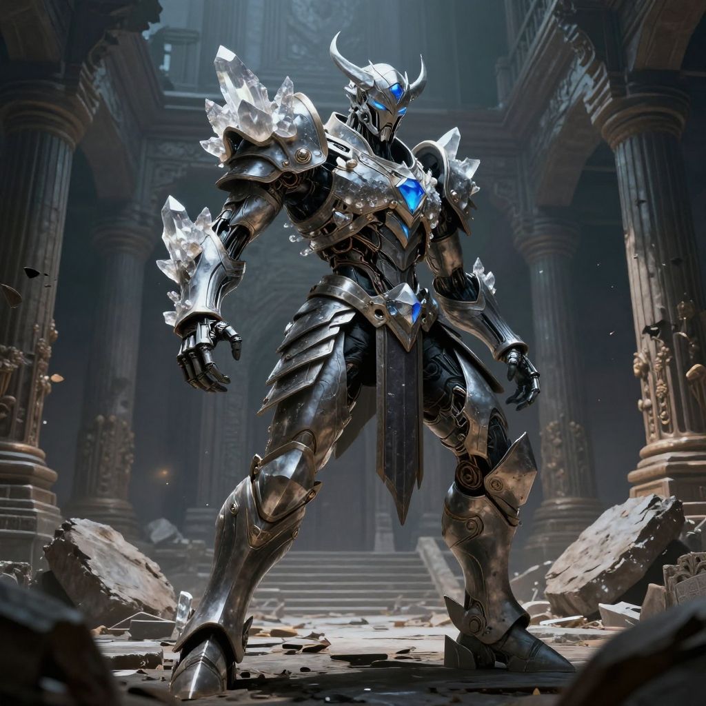 An epiform biomechanical warrior clad in layered armor with crystal growths, standing in a ruined temple, dynamic pose, cinematic lighting, dark fantasy illustration