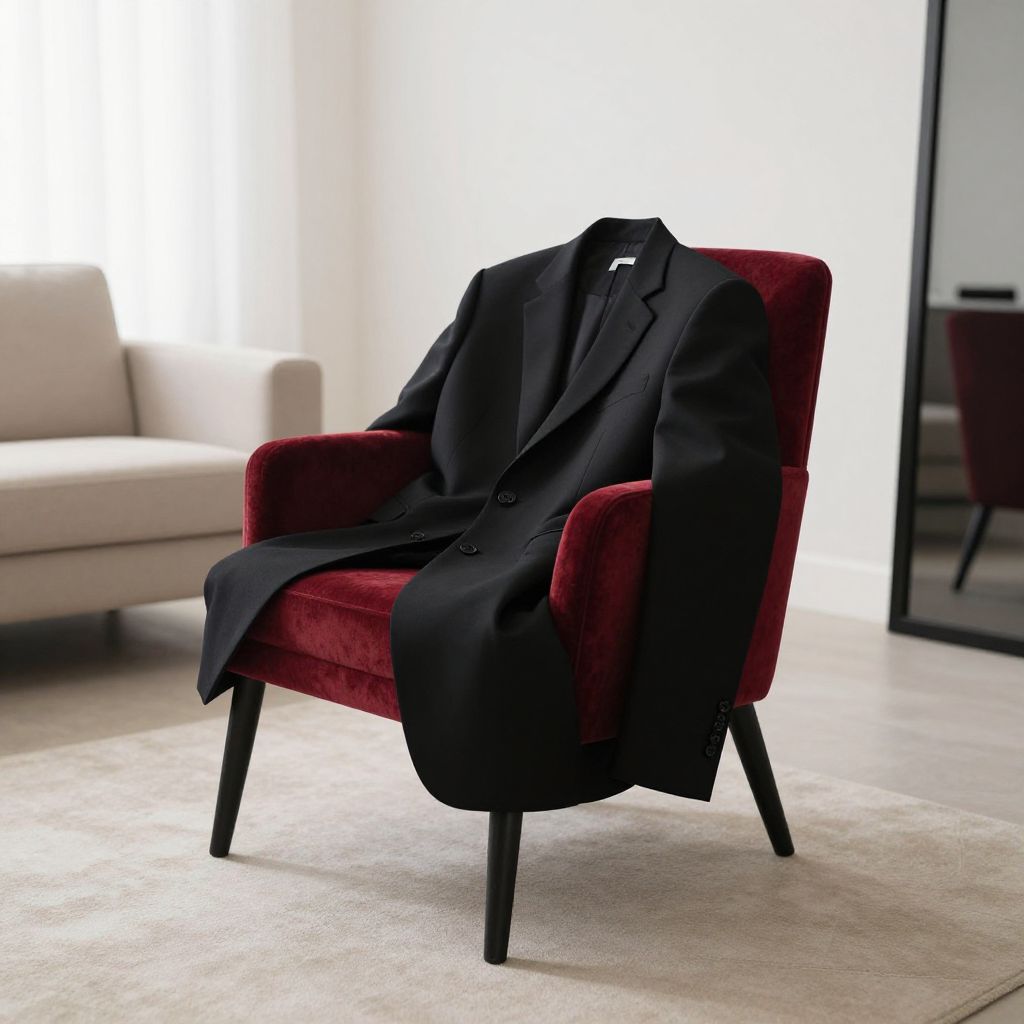 A minimalist black suit draped over a red velvet chair in a serene, modern living room with soft morning light, clean lines, high fashion photography style, elegant and still composition.