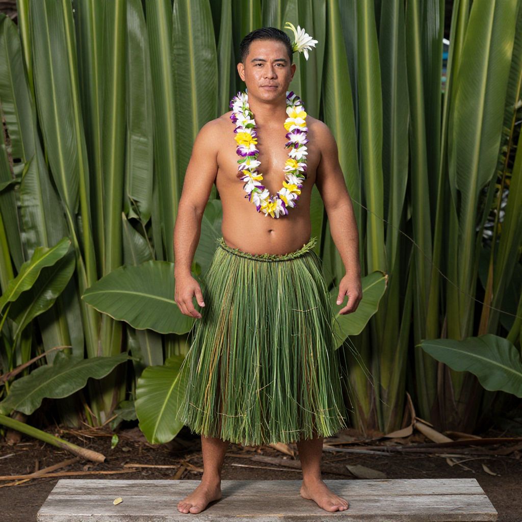 Hula Costume, man in a grass skirt and flower garland standing on a bench