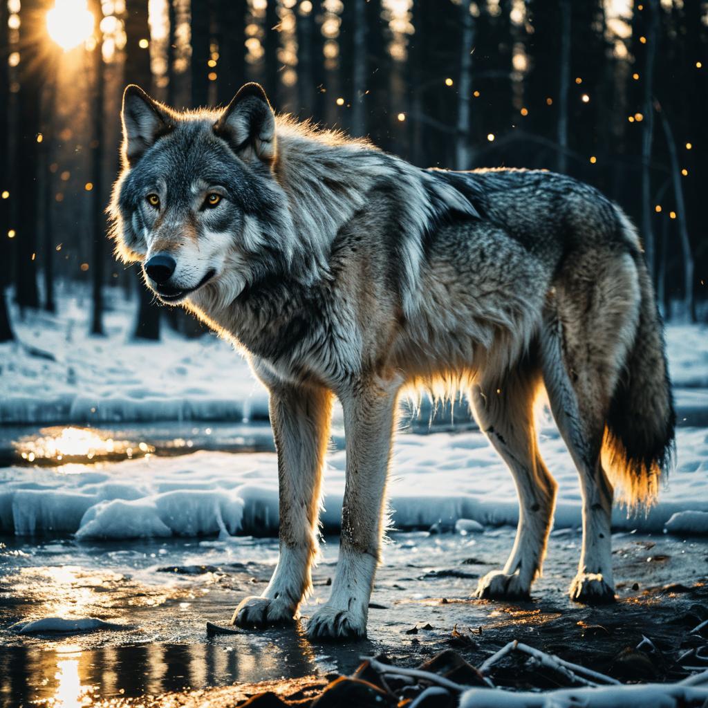 Photorealistic image of a large silver wolf standing on a frozen river in a snowy forest during golden hour. The wolf has a torn left ear and is illuminated by warm, cinematic lighting with glowing particles in the air, creating a surreal and highly detailed atmosphere.