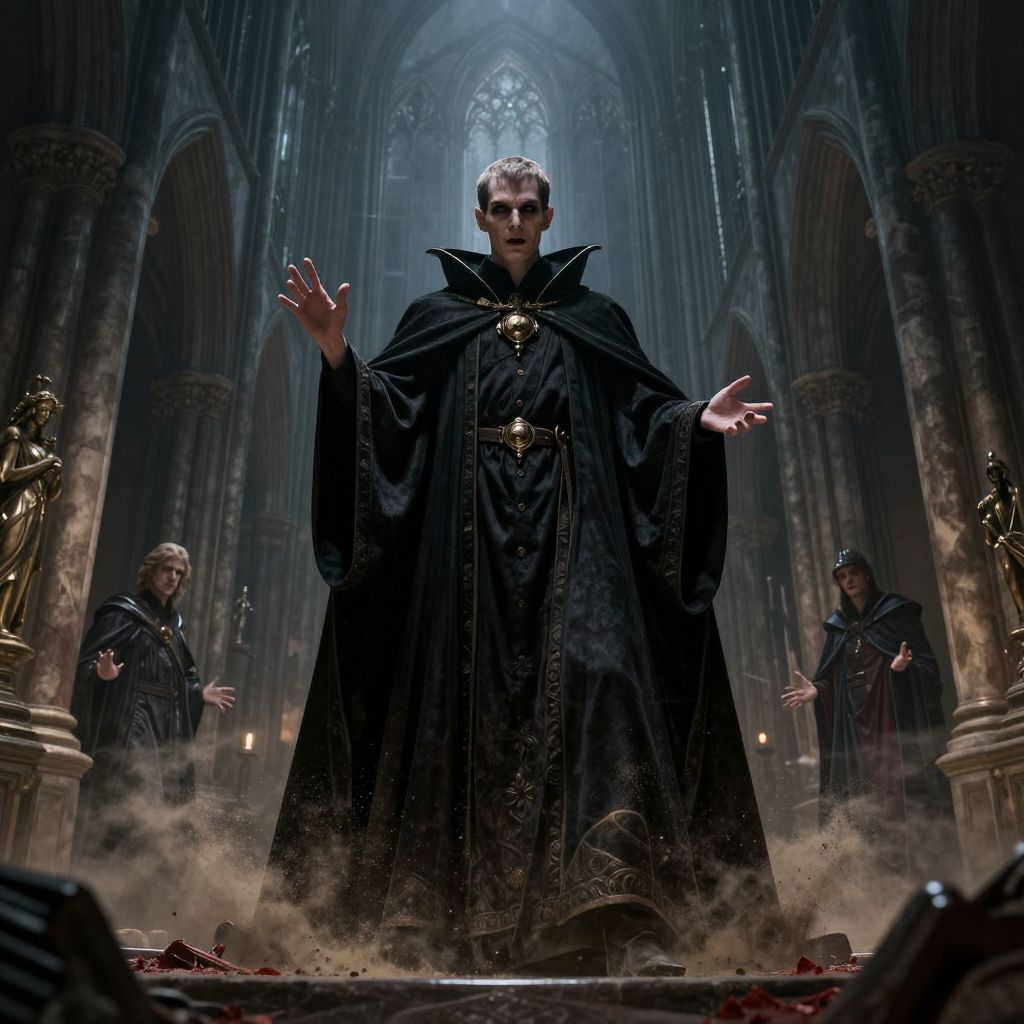 Wide - angle portrait of an evil bishop, dark magic, young man, heroic pose, full body, inside a cathedral, dramatic lighting, dark and horror, dust and blood, intricate, wild, highly detailed, digital painting, artstation, concept art, smooth, sharp focus, illustration, art by artgerm and greg rutkowski and alphonse mucha, footage from space camera