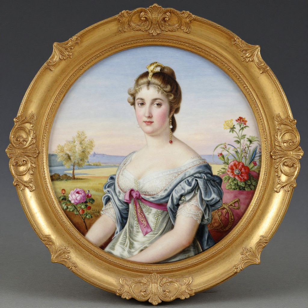 Classical portrait of a fair-skinned woman in an 18th-century blue gown, framed in an ornate gold oval frame, surrounded by vibrant
