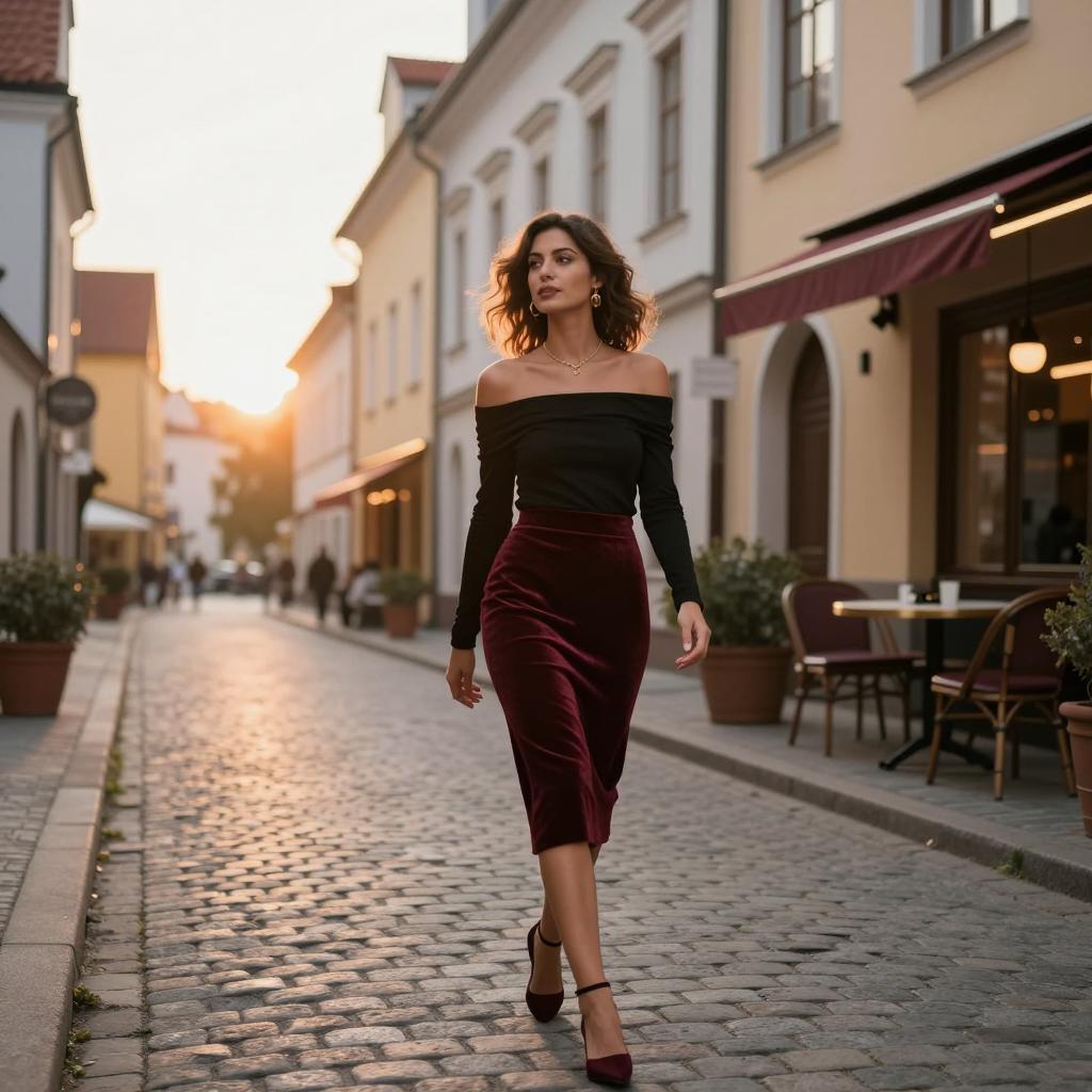 A stylish woman in an off-shoulder black top and a maroon velvet skirt strolls through a picturesque European street. The sun sets behind her, casting a warm glow on the charming cobblestone pathway and the quaint outdoor café. This scene captures a perfect blend of fashion and ambiance, ideal for lifestyle and travel themes.