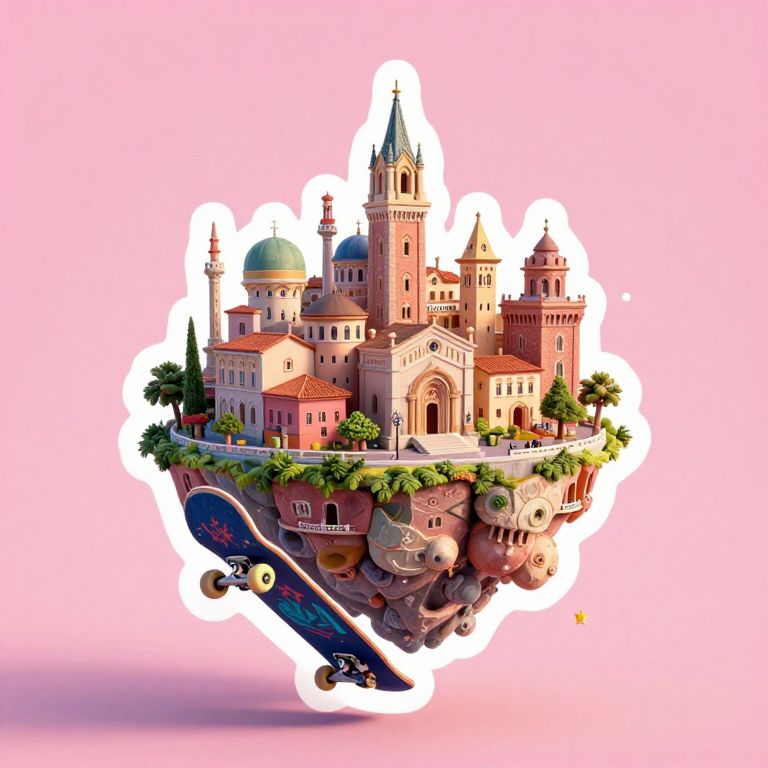 Skateboard Sticker landing page. Pixar style. Italian city. The background should be pink. The main element should be the island city floating in the space.,
