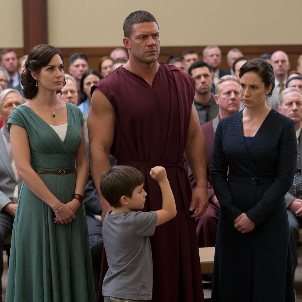 In a solemn gathering, a muscular man in a maroon robe stands protectively beside a young child raising a fist, while a woman in a green dress and another in dark attire observe intently, all set against a backdrop of a focused crowd in a scene from the NBC miniseries \"A.D.: The Bible Continues.\