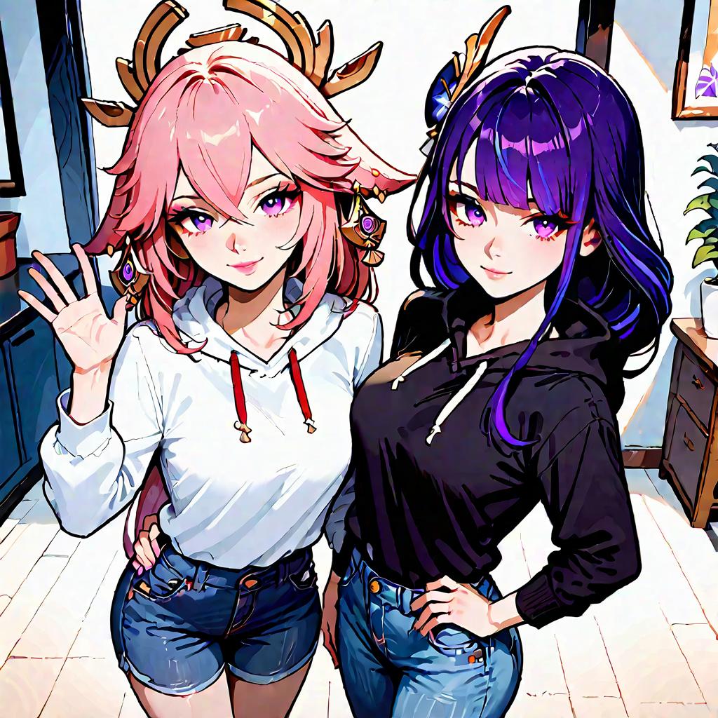 Score_9, score_8_up, score_7_up, source_anime, 2girls, princess carry, cherry blossoms, outdoors, day, acherondef, purple hair, long hair, hair over one eye, hair ornament, purple eyes, single shoulder pad, asymmetrical clothing, navel, midriff, coat, halterneck, cleavage, choker, large breasts, crop top, wide sleeve, elbow glove, black gloves, black shorts, belt, thigh boot, knee boot, asymmetrical legwear, leg tattoo, fingerless gloves, earrings, yae miko, happy, black pantyhose, pencil skirt, white shirt, office lady