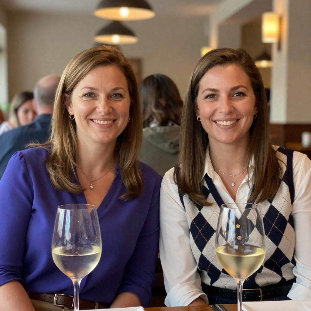Portrait of two smiling women with light brown hair seated at a restaurant table. The woman on the left is wearing a purple blouse, and the woman on the right is dressed in a white shirt paired with a diamond-patterned vest. Both have glasses of white wine placed in front of them. The background features a warm, cozy restaurant ambiance with blurred patrons and soft overhead lighting.