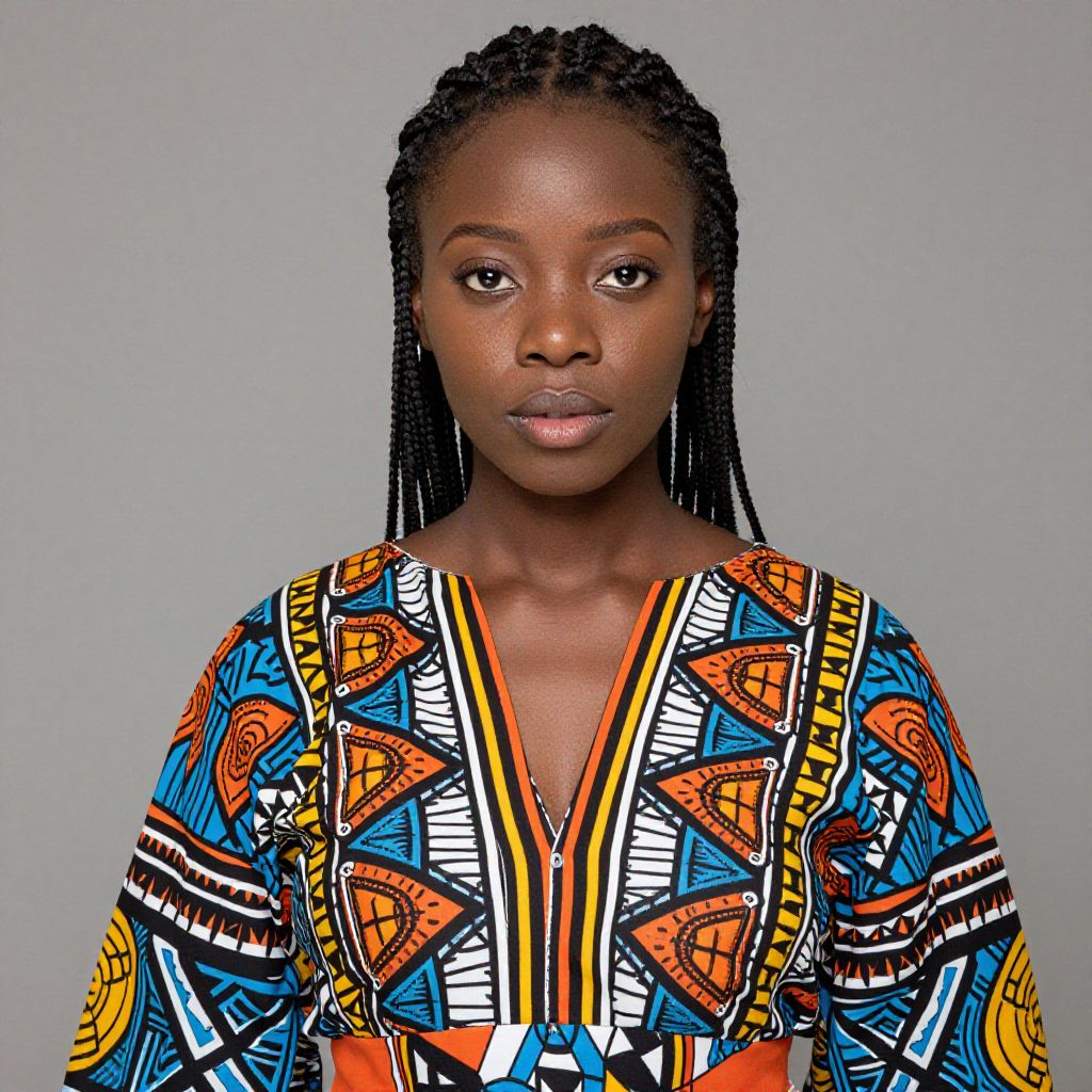 Black woman with braids in her hair, wearing a colorful outfit with a geometric pattern.