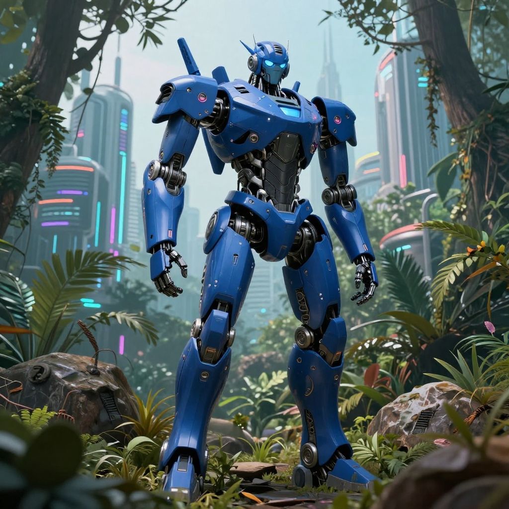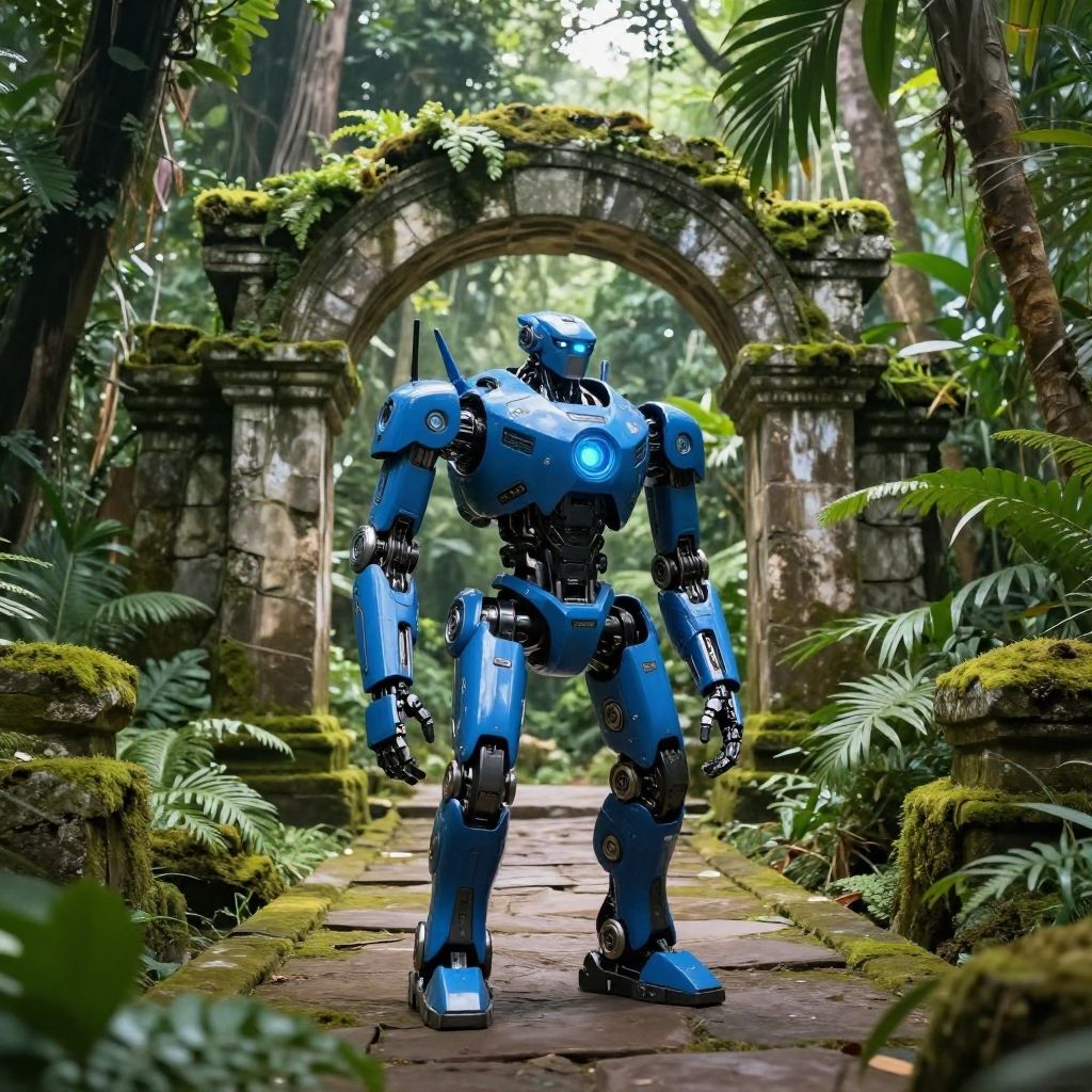 A futuristic blue and black robot with glowing circular lights is positioned on a stone pathway surrounded by lush green tropical jungle foliage. In the background, ancient moss-covered stone arches and ruins are partially visible, illuminated by soft sunlight filtering through the dense canopy. The image combines advanced technology with ancient nature, creating a contrast between modern robotics and historic architecture.