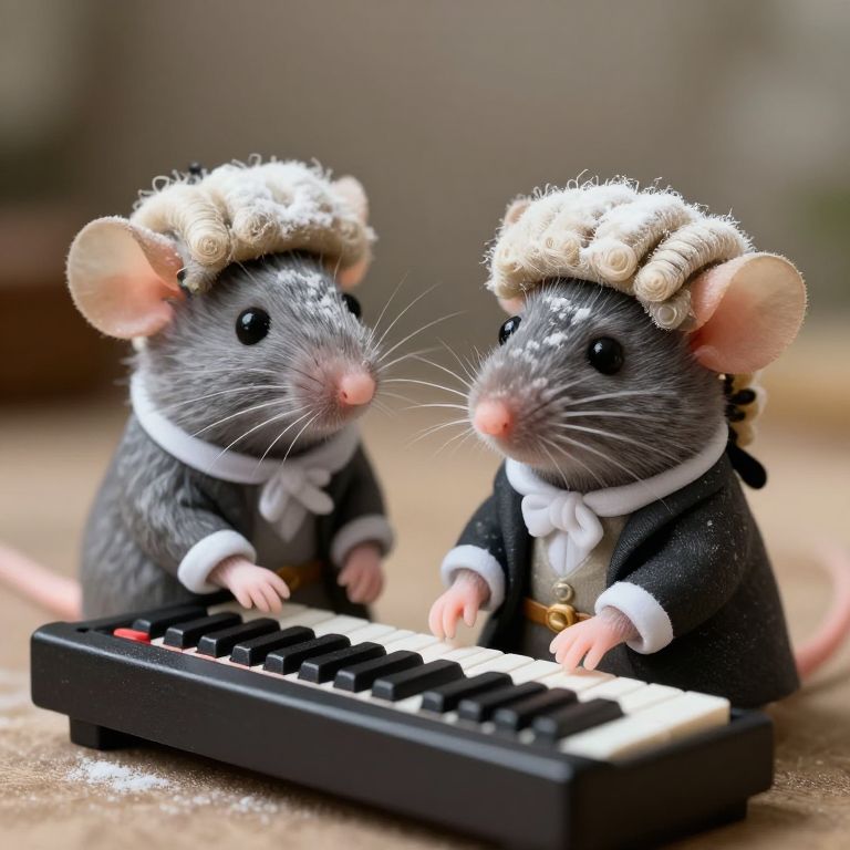 Two monochromatic mice, adorned with fluffy powdered wigs and formal attire, collaborate harmoniously on a miniature keyboard, their paws delicately pressing keys as they perform a whimsical symphony together.