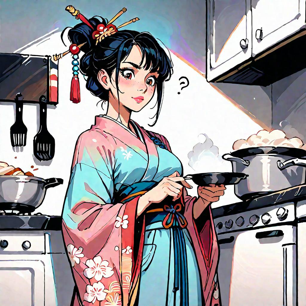 Digital anime-style illustration of a young woman wearing a traditional kimono with floral patterns and hair ornaments, standing in a kitchen holding a frying pan. The character has dark hair styled with hair sticks and a ponytail, and she appears confused while cooking near steaming pots on the stove.