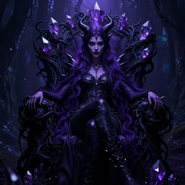 Abstract Expressionism Tyra Banks as an drow priestess, white hair, violet eyes, black leather armor, in a cave, skulls, spiders, purple glowing light, art by brom and Boris Vallejo,