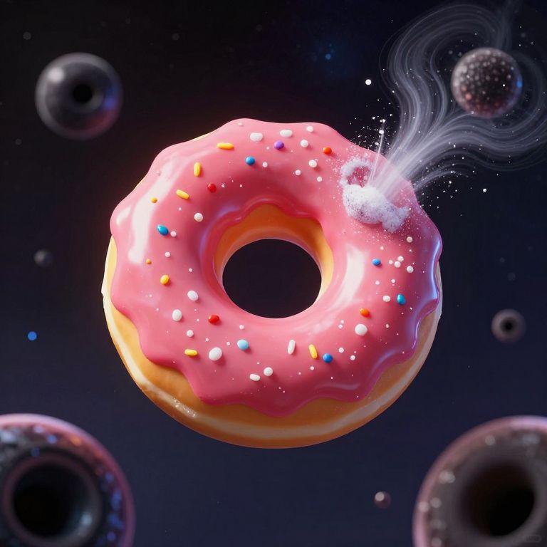 Digital artwork of a glowing, sugar-coated donut floating in a dark, starry space. The donut's golden-brown surface is spe