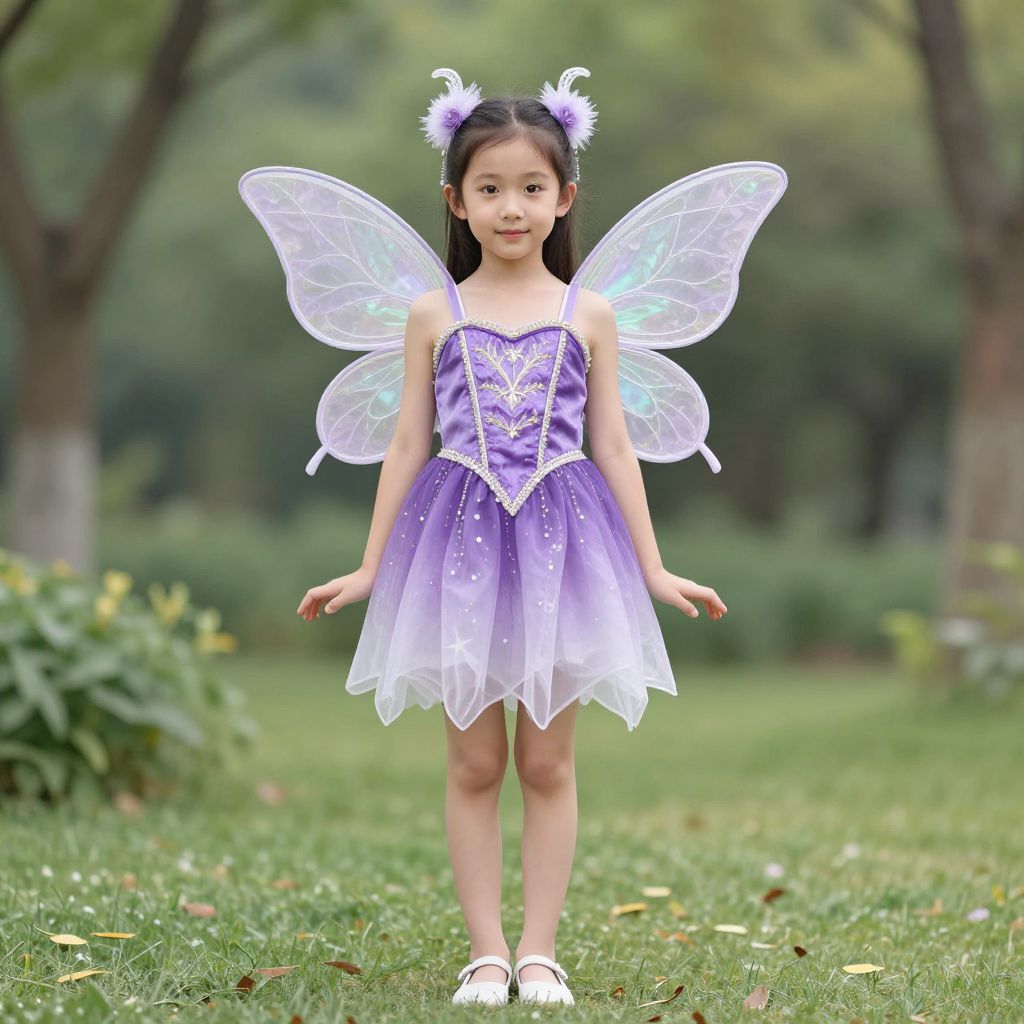 Photograph of an Asian young girl standing in a grassy park. She has long black hair adorned with a white and purple flower headpiece. She wears a purple, sparkling fairy costume with a corset-style bodice and a tulle skirt, and white fairy wings that glow with a blue-green hue. Her white shoes have a slight shine. The background is softly blurred with green trees and foliage. The girl stands centered, with a slightly forward posture, looking directly at the camera with a neutral expression. The lighting is natural, enhancing the vibrant colors of her costume.
