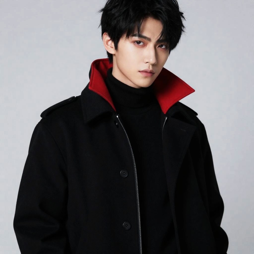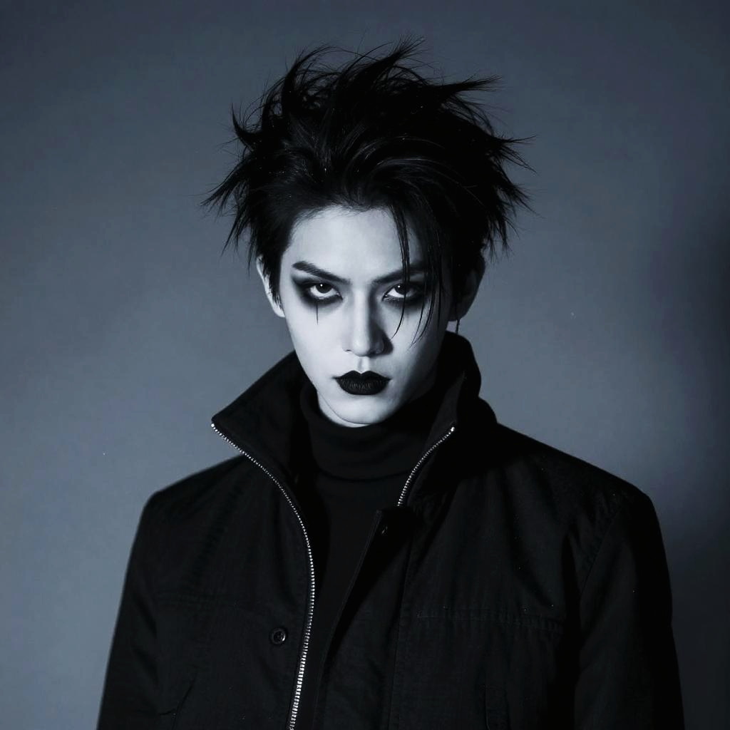 This is a moody, black-and-white photograph of a goth-style person with pale skin, dark lipstick, and dramatic makeup. They have spiky, dark hair and are wearing a high-collared, dark jacket. The background is a textured, blue-gray gradient with small white specks, adding an ethereal feel. The lighting creates a high-contrast effect, highlighting their intense expression.