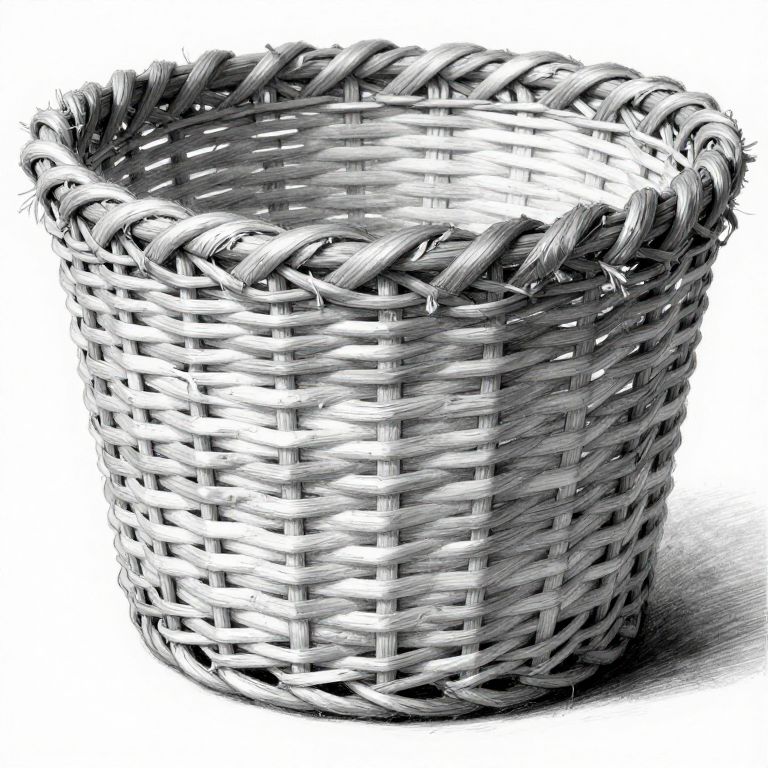 Basket texture drawing showcasing a vintage woven basket with frayed edges and tightly interlaced fibers, emphasizing texture through cross-hatching and soft shadows in monochrome.