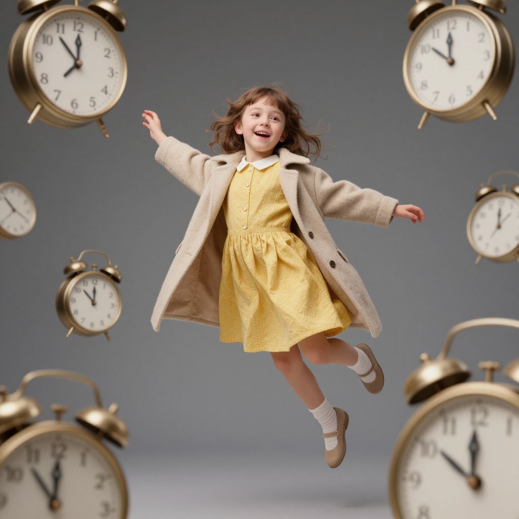 A whimsical digital artwork depicts a joyful child in a beige coat and yellow dress, seemingly floating amidst a surreal backdrop of floating clocks, evoking a dreamlike, timeless atmosphere with a touch of fantasy and high-definition detail.