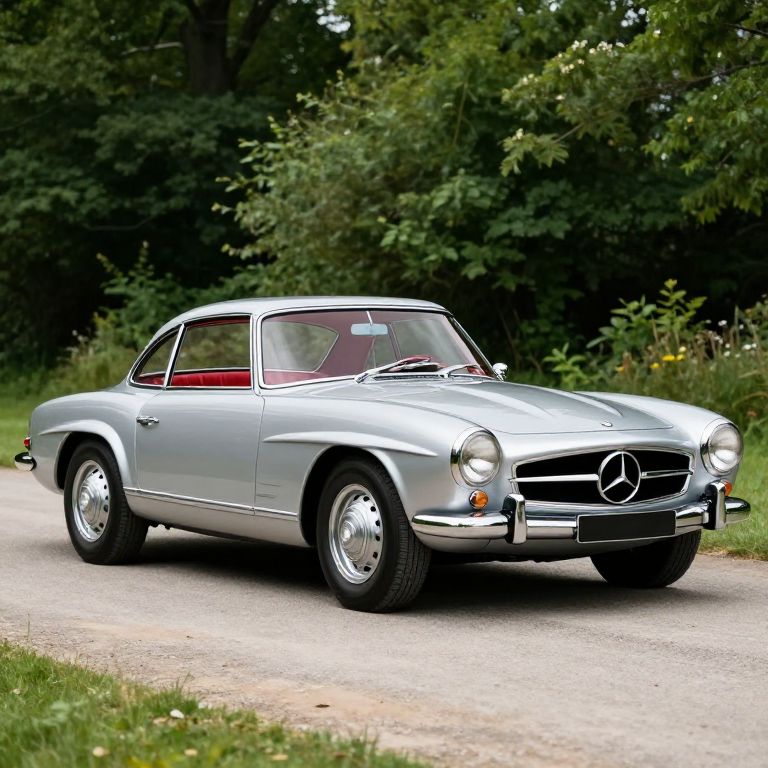 A classic Mercedes-Benz 230 SL Automatic Coupe (Typ W113) is showcased in a high-definition photograph, featuring a sleek silver exterior and vibrant red interior, set against a lush, green, natural backdrop with a vintage aesthetic.