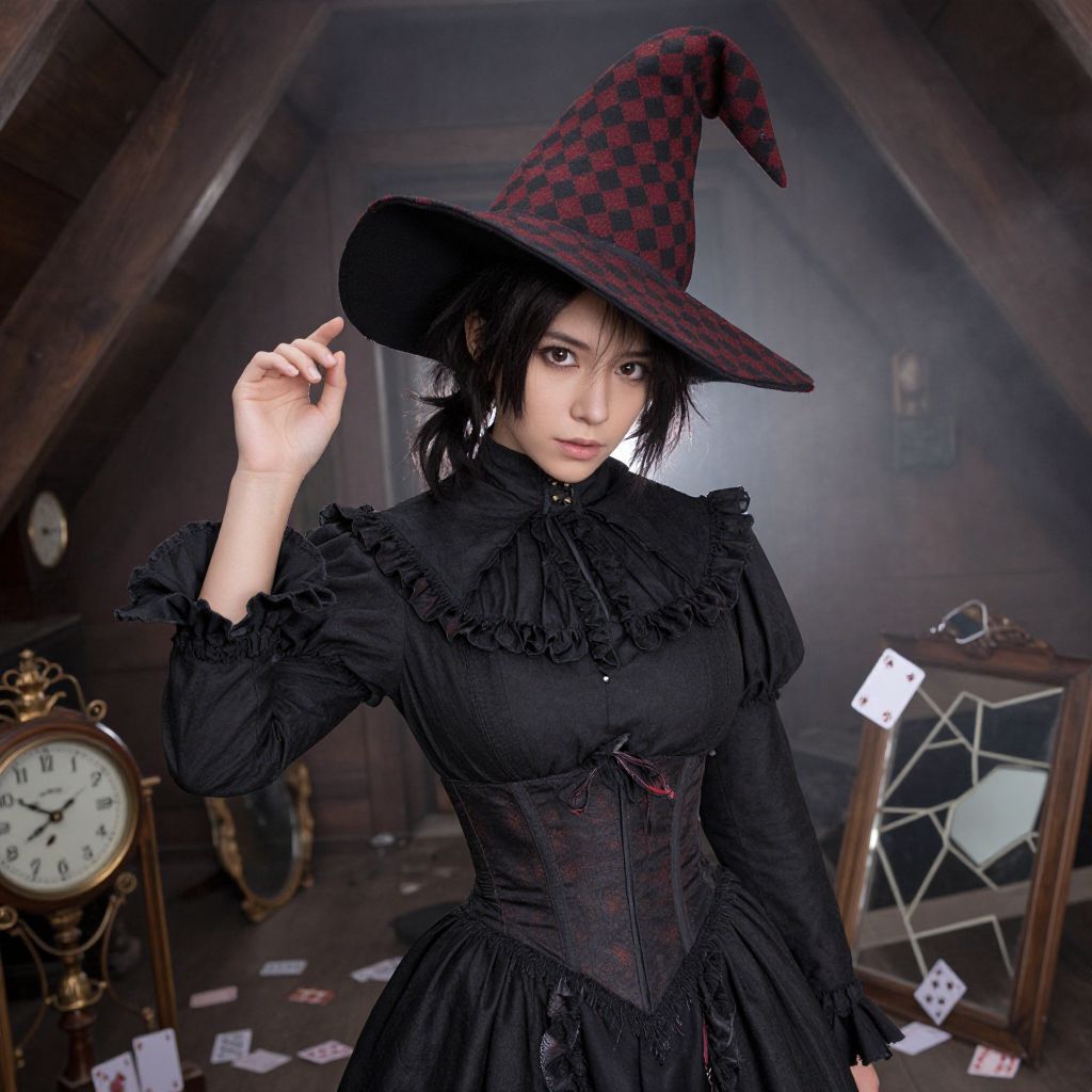 Photograph of an Asian woman in a black gothic dress and red-checkered witch hat, holding her hat in a dimly lit attic filled with
