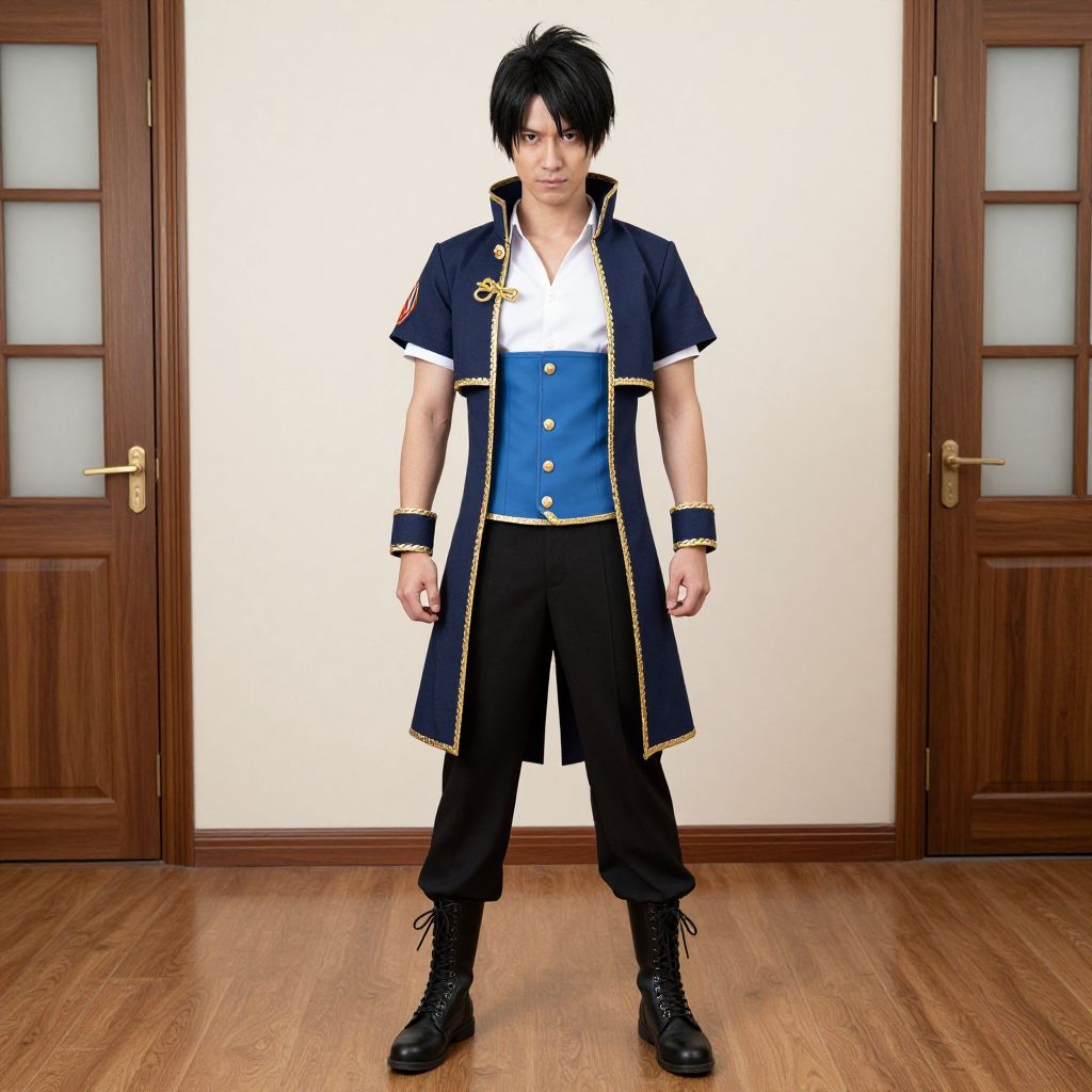 Photograph of a young man with black, tousled hair standing confidently in front of a wooden door with frosted glass panels. He wears a navy blue, short-sleeved coat with gold trim over a white shirt and blue vest, black pants, and black boots. A gold pendant hangs on his chest, and black wristbands adorn his wrists. The wooden floor contrasts with the white wall behind him, adding warmth to the image. His intense gaze and poised stance suggest a character from a fantasy or anime setting.