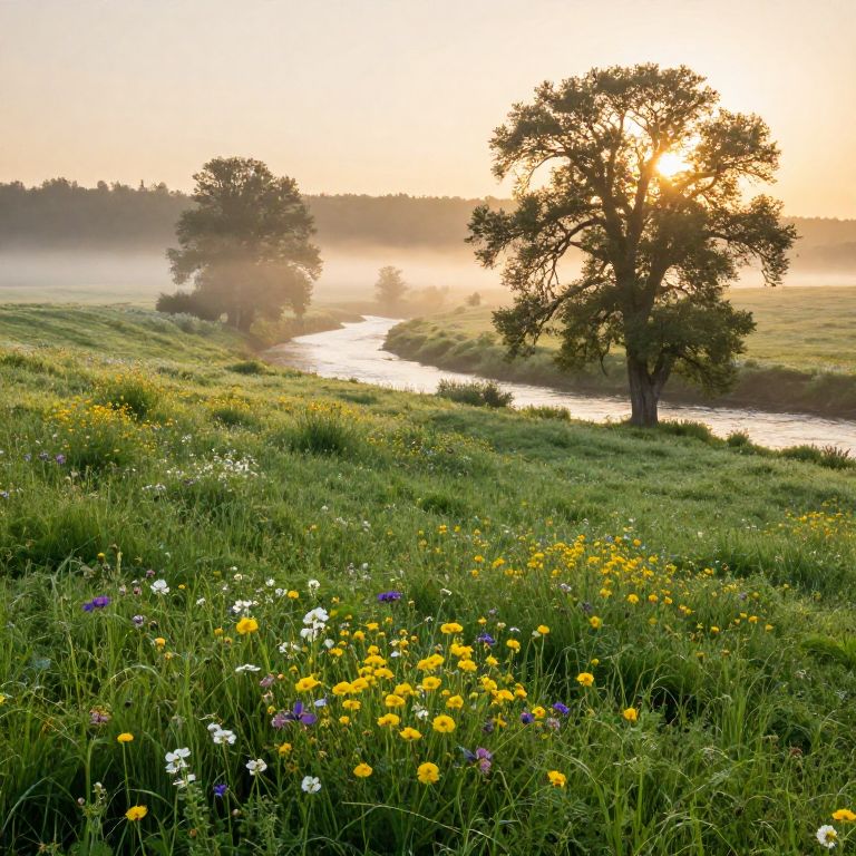 Natura landscape at dawn, vibrant wildflowers blooming across rolling green hills, soft mist hovering over a serene river, detailed flora and fauna, warm golden sunlight filtering through ancient trees, peaceful and harmonious natural environment, hyper-realistic style