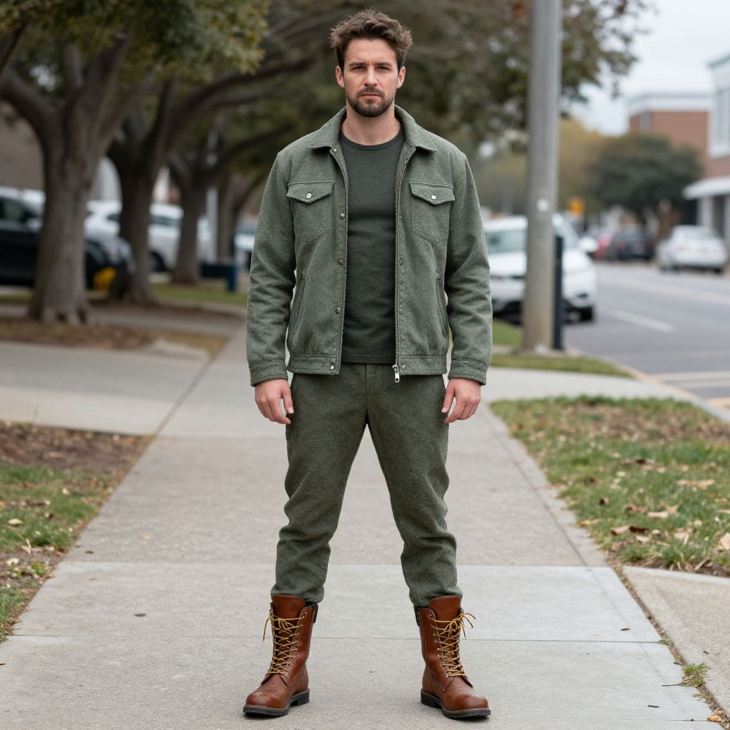 Rock Clothing Costume, man in a green jacket and brown boots standing on a sidewalk
