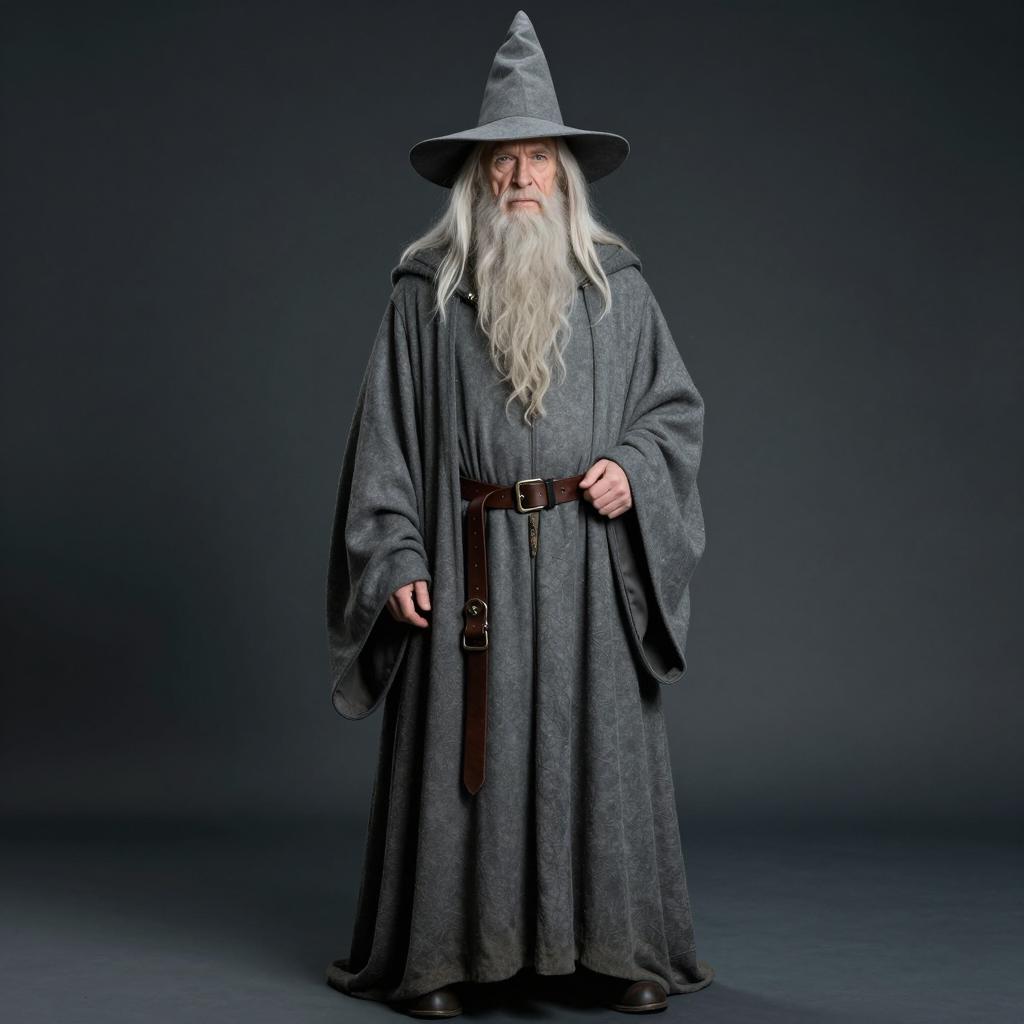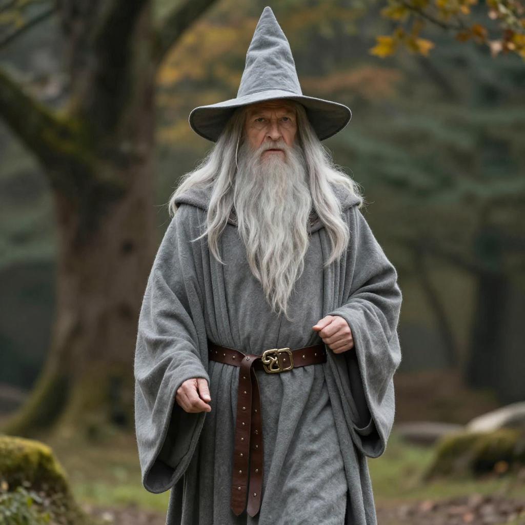 Elderly male cosplayer dressed as Gandalf from The Lord of the Rings, wearing a tall pointed grey wizard hat, long white hair and beard, flowing grey robe, and brown leather belt. The full body portrait is set outdoors with cinematic lighting and a blurred natural background featuring green trees and autumn tones.
