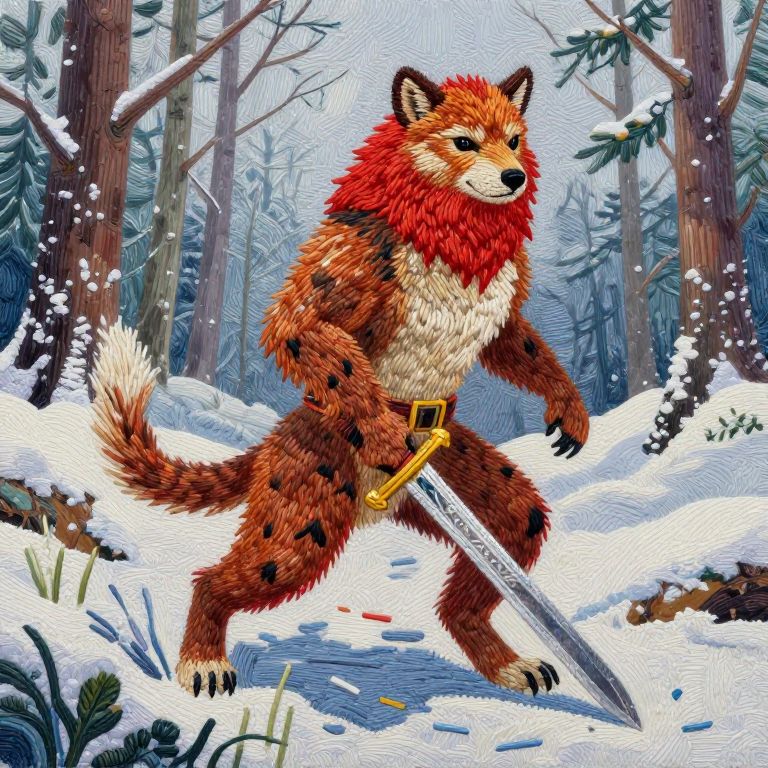 Embroidery Stitch Guide low dynamic angle full body, brilliant color wilding ranger with sword. Red hair and beard. Snowscape forest. Volumetric ambient light. Oil painting.,