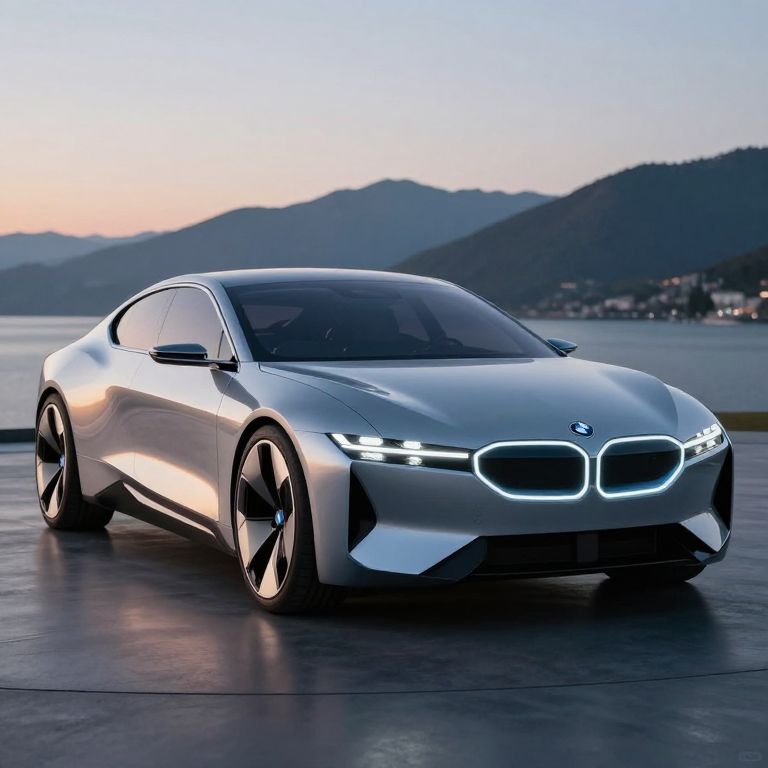 Photograph of a sleek, modern, silver BMW concept car with glowing blue LED headlights and black accents, parked on a reflective concrete surface by a serene lake. The car's aerodynamic design features smooth curves, large black alloy wheels, and a prominent kidney grille. In the background, rolling hills and a small town are visible under a pastel sunset sky. The car's futuristic design contrasts with the natural setting, highlighting its high-tech aesthetic. The image captures the car from a slightly low angle, emphasizing its streamlined shape and advanced design.